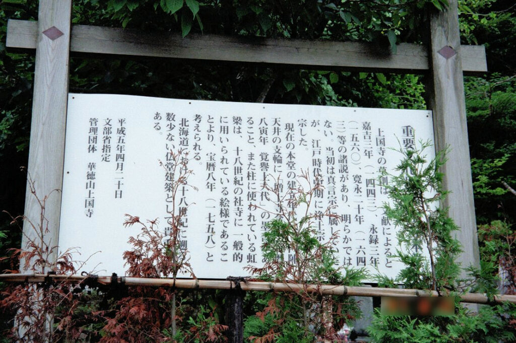 上国寺は、寺伝によると嘉吉3年(1443)僧秀延阿闍梨が真言宗として創建、3代大蔵法印秀海の時から領主菩提所となり、10代了徹の時浄土宗に改宗し、のち松前光善寺の末寺になったそうです。本堂は国の重要文化財で、建築年代ははっきりしませんが永禄年間から寛永年間(1558~1644)の頃のもののようです。