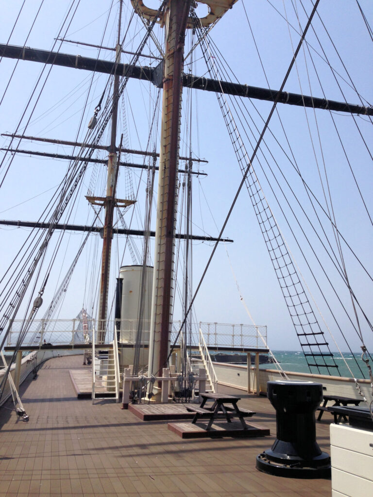 3年ぶりの道南旅行三日日、法華寺・旧檜山爾志郡役所と回った後は奥さんのリクエストで開陽丸へと向かいました。この日は風が強くて甲板に出ると風で飛ばされそうでした。近くの鴎島もよく見えました。中には引き上げられた多くの遺物が展示してあったり、人形を使って再現してあったりと、工夫して展示されています。私はやりませんでしたが、榎本武揚の衣装等を着て写真を撮ることもできます。うちの息子は入り口でもらったクイズを探して答えを探すのを楽しんでいました。(2015/5/5)