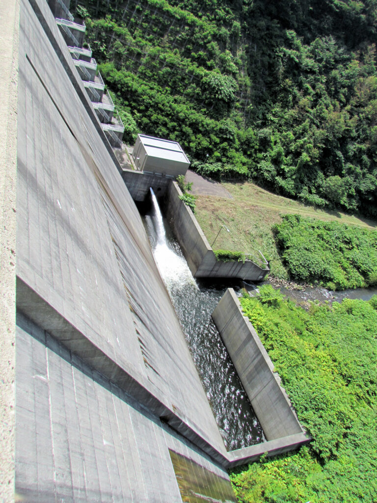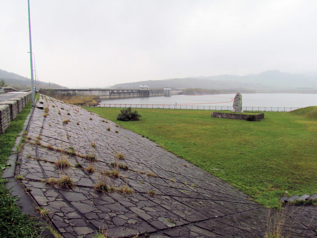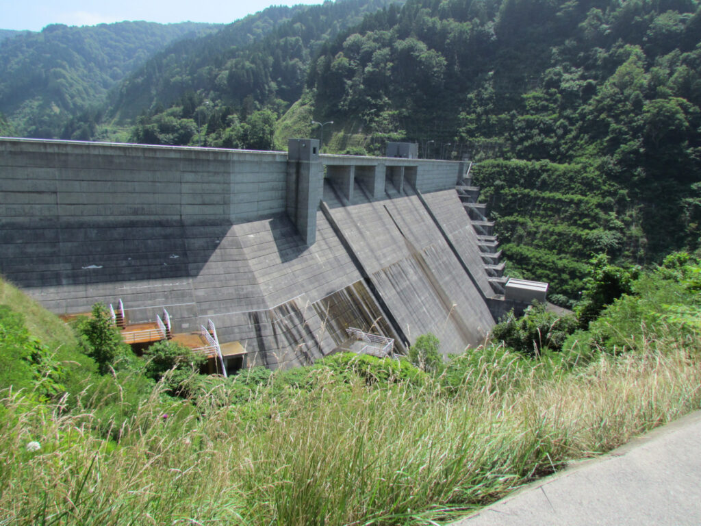 ダムまでの道が結構狭くて車2台がすれ違えないような道でした。でもダムはとってもきれいなダムでした。途中で堤体が曲がっているのは、地盤が悪いため設計段階でそのようにしたようです。このあと道の駅上ノ国もんじゅに寄ってダムカードをもらいました。