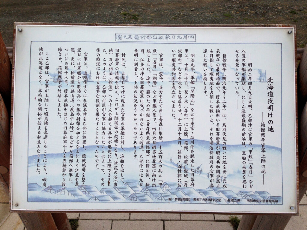 その碑の説明板によると、明治2年(1869)4月9日未明、乙部の海上に官軍の大艦隊が押し寄せ、津花(元町)、相泊(館浦)に上陸し、乙部に参謀本陣を設置して臨戦態勢を整え、江差を奪還、その後箱館に進軍し五稜郭を目指したそうです。というわけで、上陸した場所にその跡地として碑が建っているそうです。