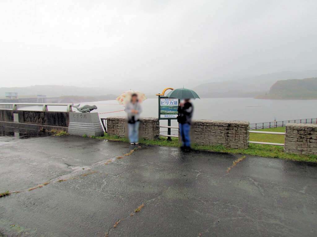 この日は今金の美利河(ぴりか)ダムに行きました。ここは忠別ダムと同じくロックフィルダムと重力式コンクリートダムの複合(コンバイン)ダムという珍しい型式です。ダムカードの情報によると、洪水調節するダムの中では堤頂長が日本一の長さ、現存するダムの中で美利河ダム魚道は日本一の長さなど見どころがいろいろあるようですが、写真でおわかりのようにこの日は雨だったので、ゆっくりダムを見る間もなく、早々に退散しました。帰る途中にピリカ遺跡があったので、ちょっとのぞいてきました。