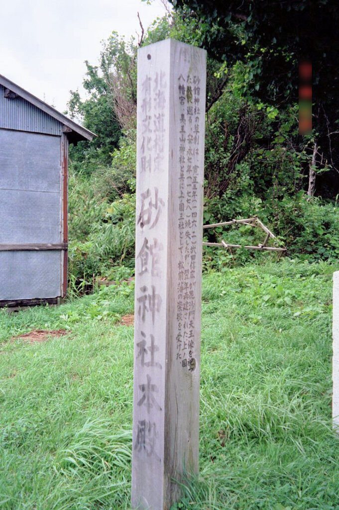 砂館神社のある場所は松前家の始祖・武田信廣が新婚生活を送ったという洲崎館跡にあります。この神社は寛正3年(1462)武田信廣が古櫃の浜に流れ着いた黄金の毘沙門天を館神として祀り、毘沙門堂と称したのが創建といわれています。明治4年(1871)に砂館神社と改称、祭神も素戔嗚尊に改められました。現存の本殿(道文化財)は安永8年(1779)の造営と考えられています。