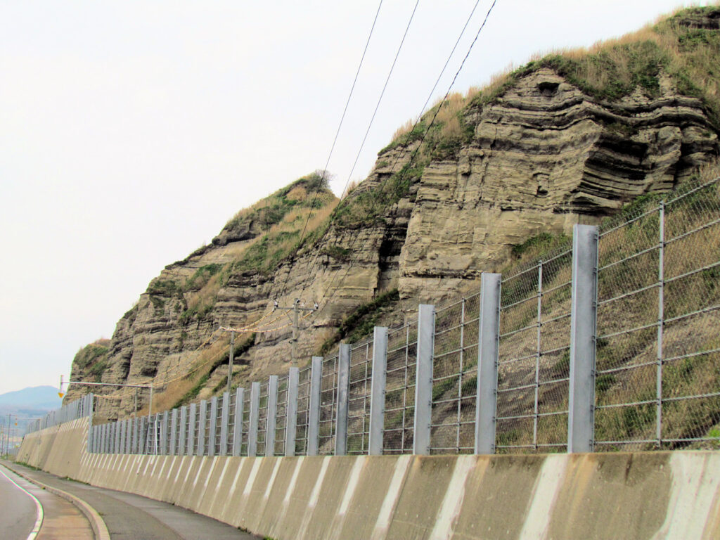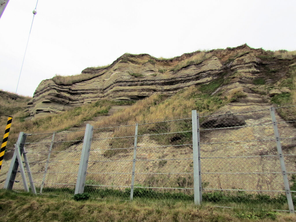 3年ぶりの道南旅行二日日、午後は道の駅巡りです。江差を通り過ぎ、「ルート229元和台→てっくいランド大成」と回った後、国道229号線を江差方面に戻りました。旧熊石町を通り過ぎ乙部町の市街地の手前で素晴らしい景色が見えてきたので写真におさめてみました。写真の場所のもう少し南が館の岬という所で、白亜の断崖が東洋のグランドキャニオンと呼ばれているそうです。凝灰岩等の地層が地殻変動で隆起し、その断層面が露出しているそうです。