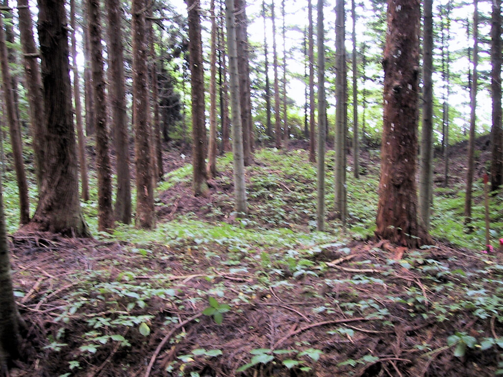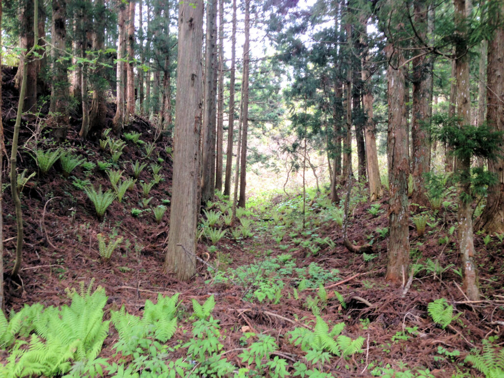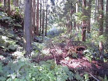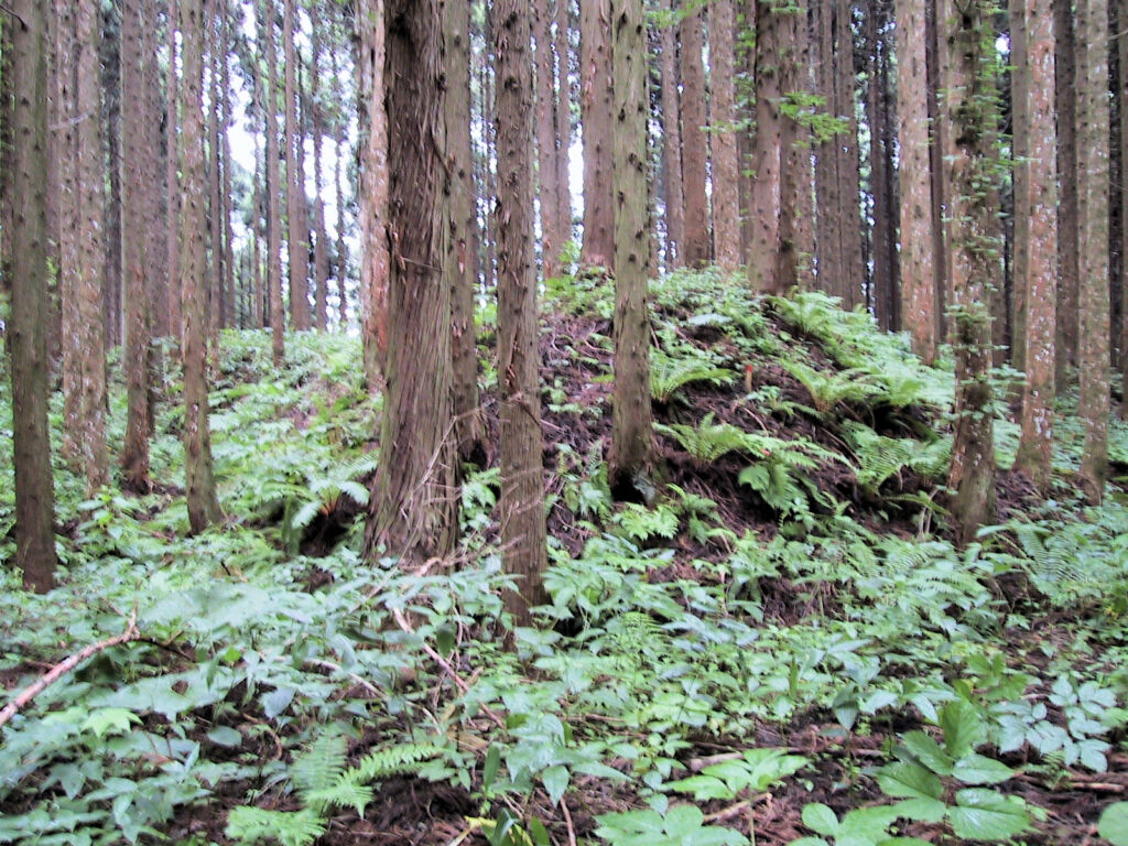 しばらく進むと、大館の北端にたどりつきました。この先には深さ7m、幅30mもある大堀切があり、東側には真ん中に土塁をはさんだ二重空堀があるそうですが、藪が密生していて進むことができず、しかたなく先に進むのを断念して、先ほどの杉林を抜けて元の方に戻りました。