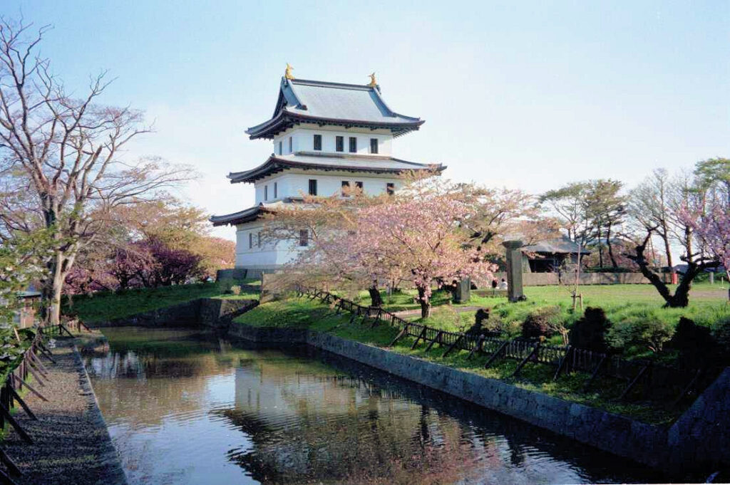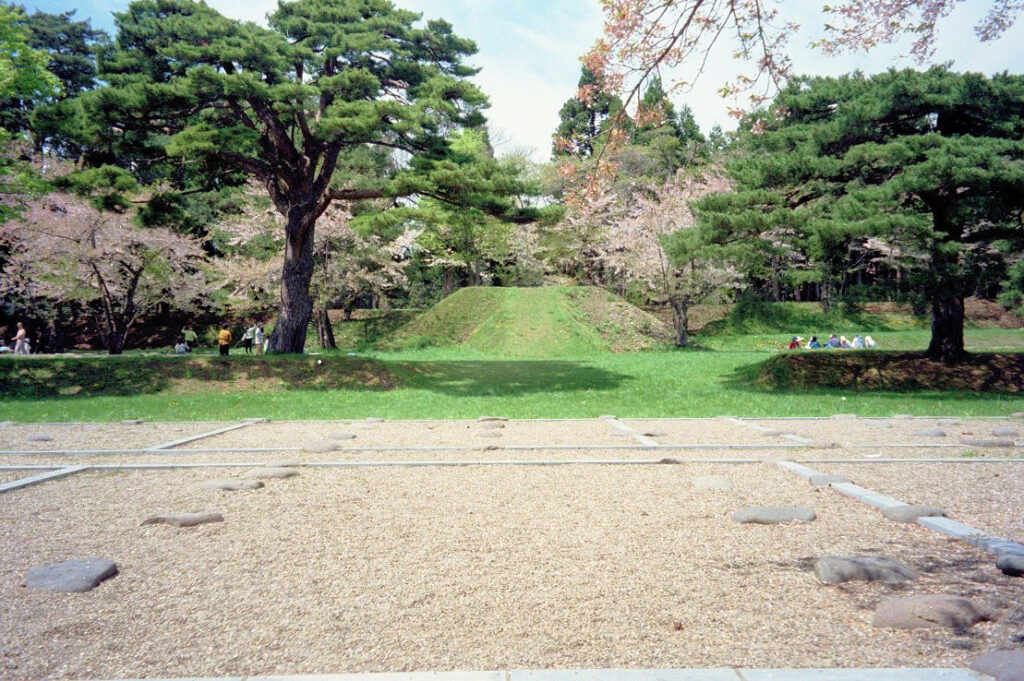 陣屋に着くと、桜があちこちで満開で、これまたきれいでした。ここの桜は五稜郭と同じような白くて小さな桜でした。桜の木の下に場所を決めると嫁さんをそこに置いて裏門そしてその奥の火薬庫跡を写真におさめ、また戻ってきて今度はまっすぐ伸びる空堀や東角にある象棋頭閉堡形式の砲台跡、そして表門と空堀、そして土塁上に咲く桜を一枚の写真に収め戻りました。今日は昨日の教訓から函館駅でほたてめしの駅弁を買ってきまして、桜の下でのんびりしながら昼飯を食べました。(2003/5/3)