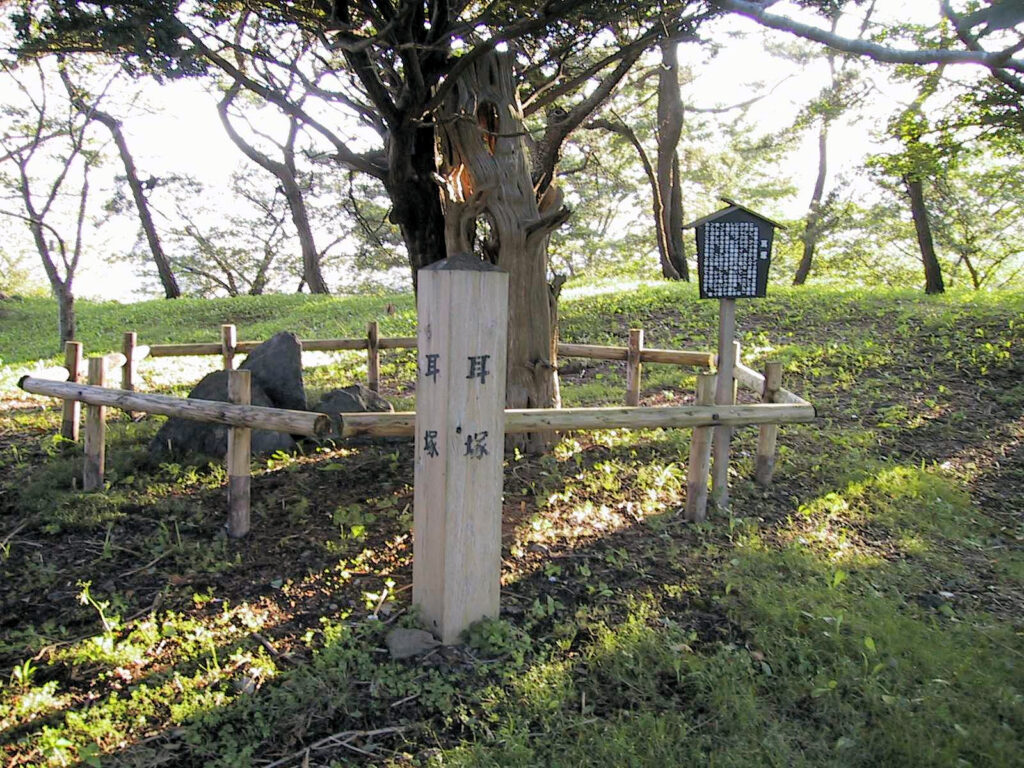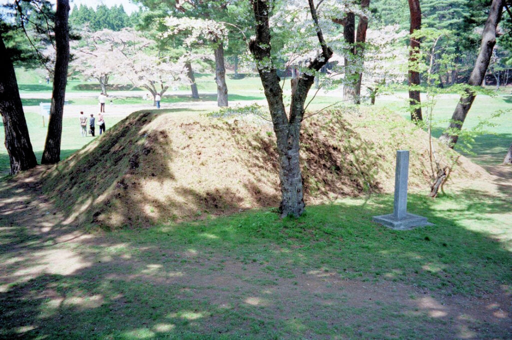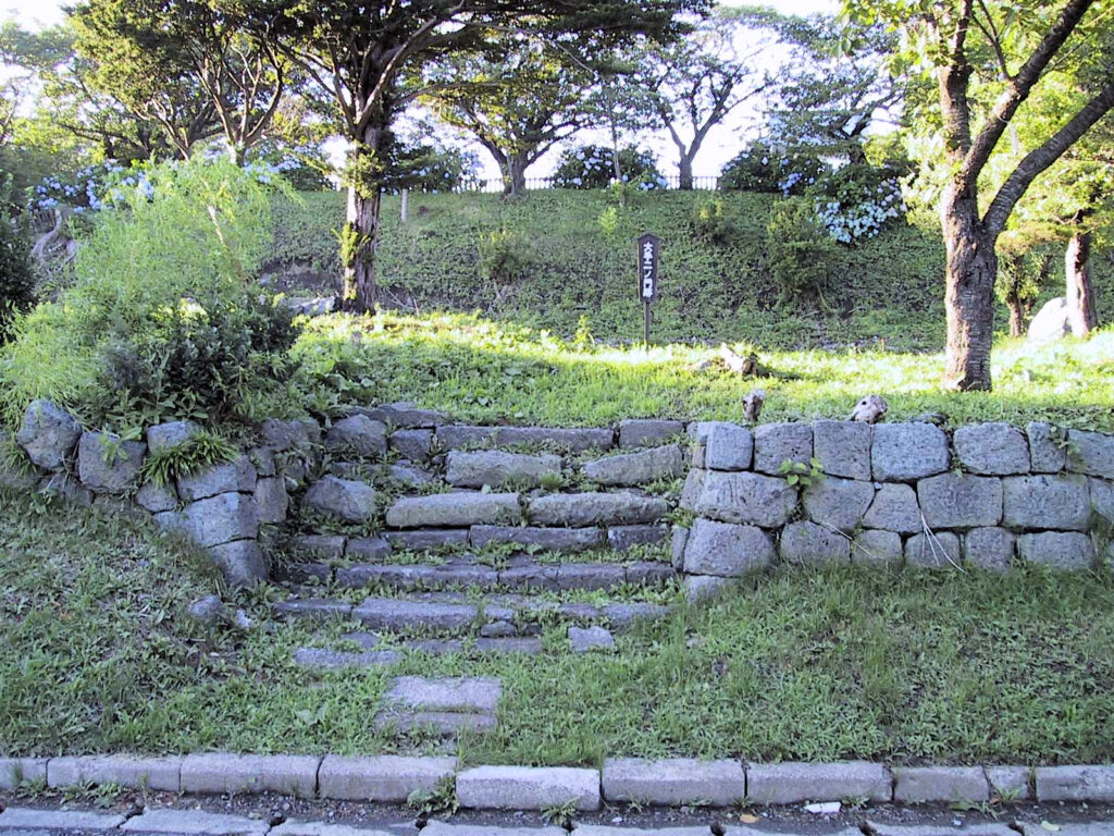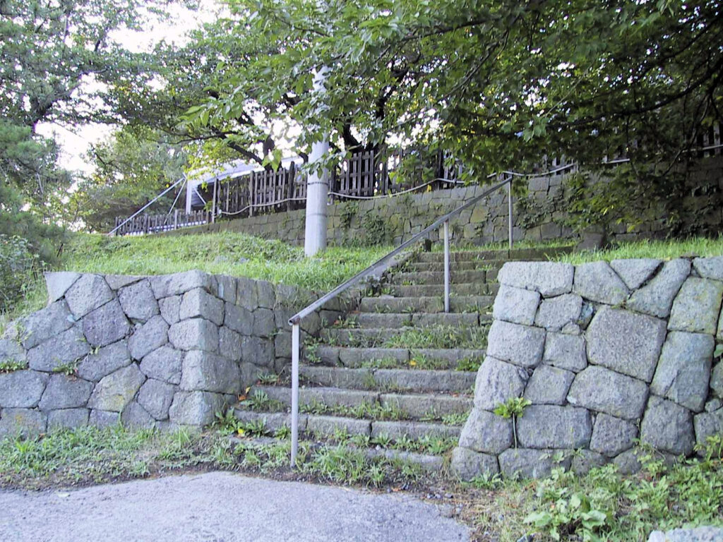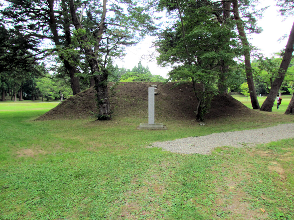 天神坂や馬坂の方を見た後、大手門跡の方に進みましたが、この辺もかなり石垣が残っていますね。それから更に上に行ってみたところ、以前本丸御門の左側の方のプレハブ小屋の中に収納されていた旧本丸御殿表門が修復されて本丸御門前の広場の端の方に立っていました。ですが、すでに天守は閉館していましたので、横から眺めることしかできず、次の日にじっくりと見ることにして、本丸表御殿跡の広場の方に行きました。すると以前は気付きませんでしたが、端の方に土塁が残っていますし、シャクシャインの戦い終了後、首の代わりに松前に持ち帰った耳を埋めたという耳塚がありました(^^;)