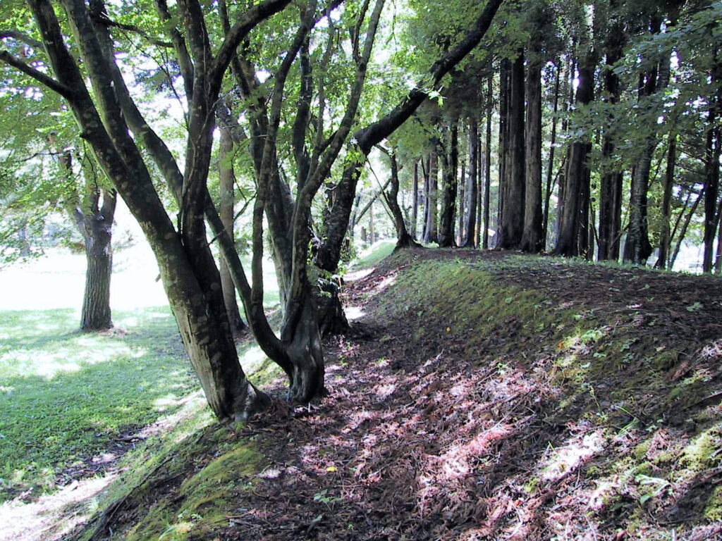 搦手側(北側)と西側は土塁・空堀の周辺を樹木が覆っているので、写真に撮ると土塁の屈曲がわかりにくいですが、東側は途中土塁の外側に何の障害物もない部分があるので、土塁の形を確かめたい場合はこちら側を見るのが良いでしょう。