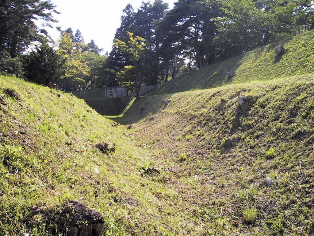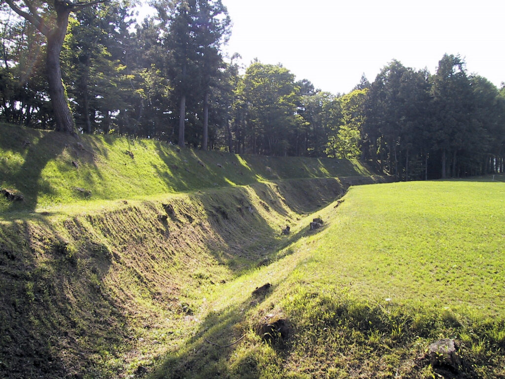 ここは大館と小館の二つの郭から成っており、手前の小館と背後の大館の間には幅8m、深さ5mの空堀によって遮られているそうです。大館は東西は急峻な崖を防壁とし、南正面には橋と塞門があったと思われ、北面にも深さ7m、幅15mの空壕がめぐらされているそうです。
