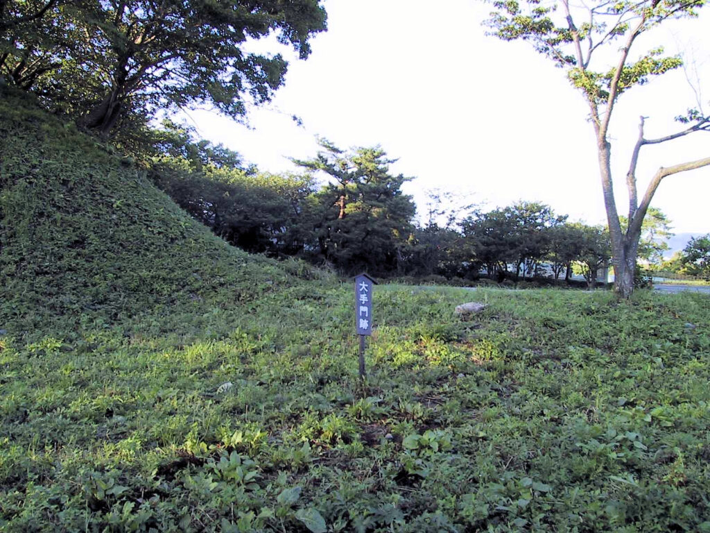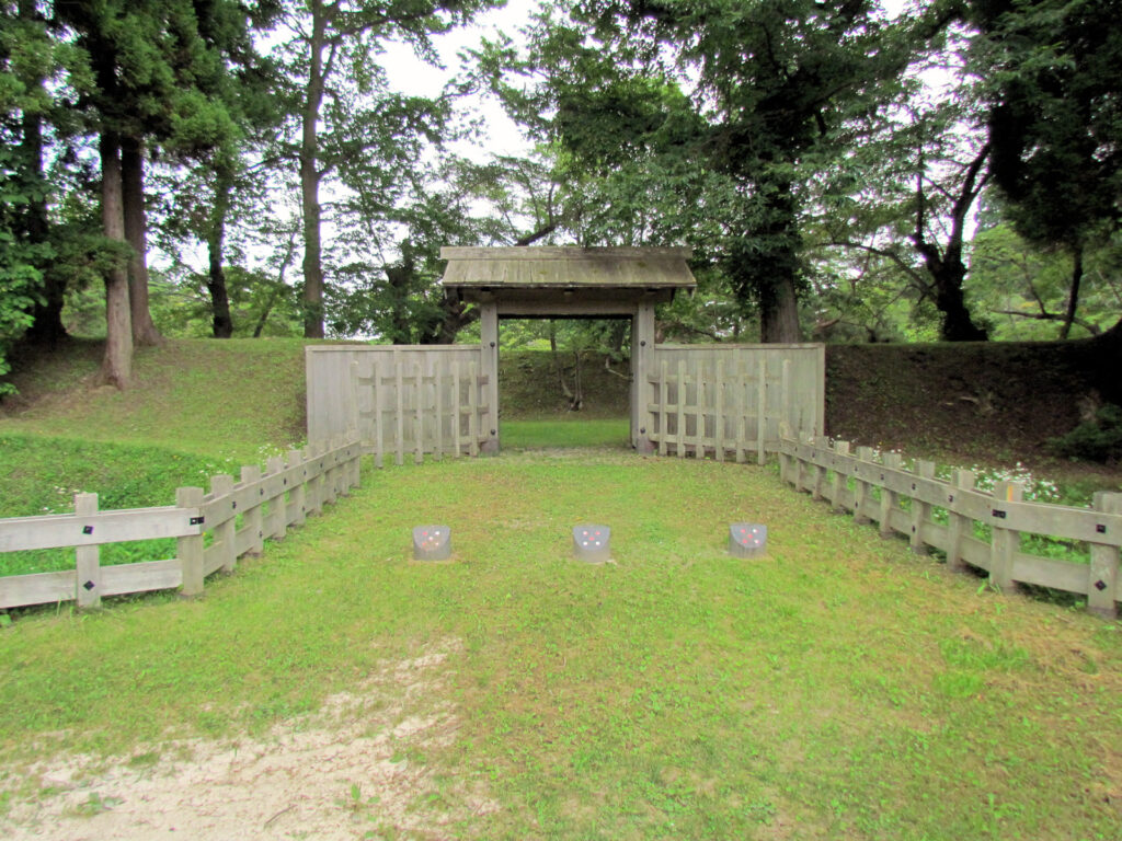 午前中断続的に降り続いた雨も、この頃には上がっていたのですが、陣屋内の草むらは湿っていて、そのせいで靴の中をぬらしながらの訪城となりました(^^;)まず目に付いたのは大手門です。2年前に来た時にはなかったのですが、なかなか立派な大手門&搦手門が立っていました。また各所に立っている遺構等の説明板も前回にはなかったもので、史跡としてきちんと整備しようという気持ちが感じられ好感が持てました。