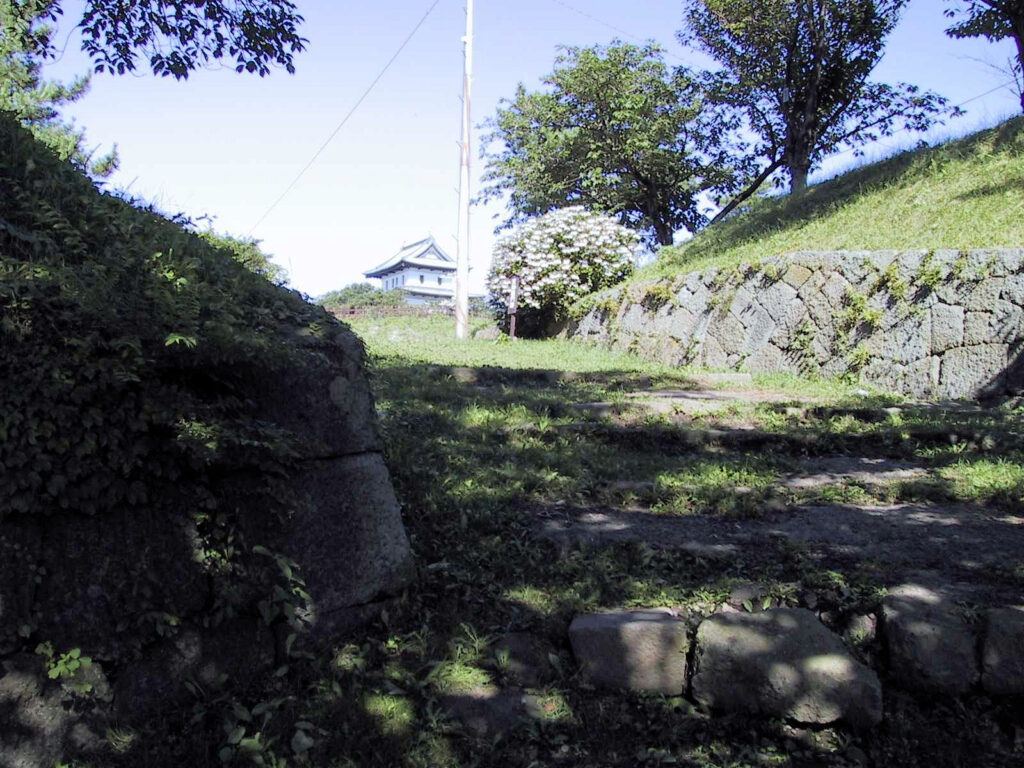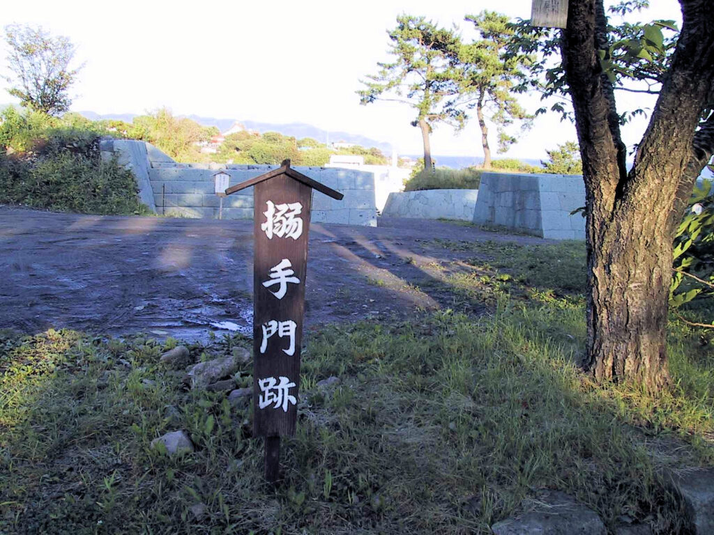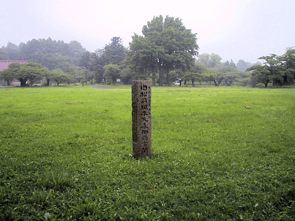 つい先月松前城を見たばかりでしたので、今回松前城はさあっとしか見てません。天守裏の広い草地側に行くと「旧本丸表御殿玄関」という碑があったので、その写真を撮ったのと、その付近から天守と本丸御門を写真に納めたくらいです。 (2001/7/30)
