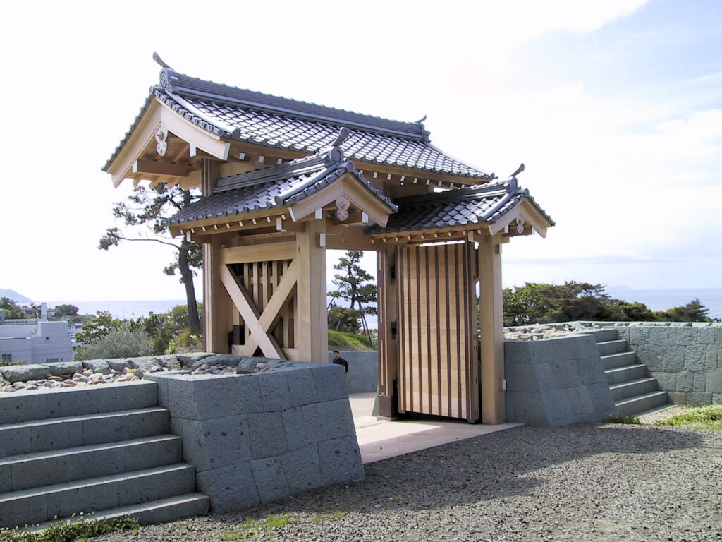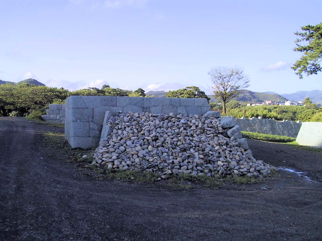 前回きちんと見なかった東側の隅にある砲台部分を見てみましたが、切れ込みが6ヶ所あり、そこが砲座になるようで、その丁度真ん中には6門の大砲を入れていたという「大砲入跡」が平面復元されています。その他にも多数の建物跡が平面復元されています。