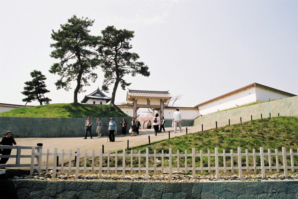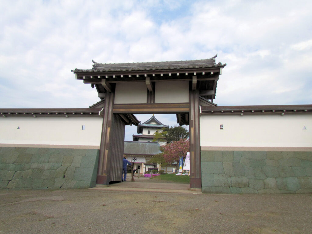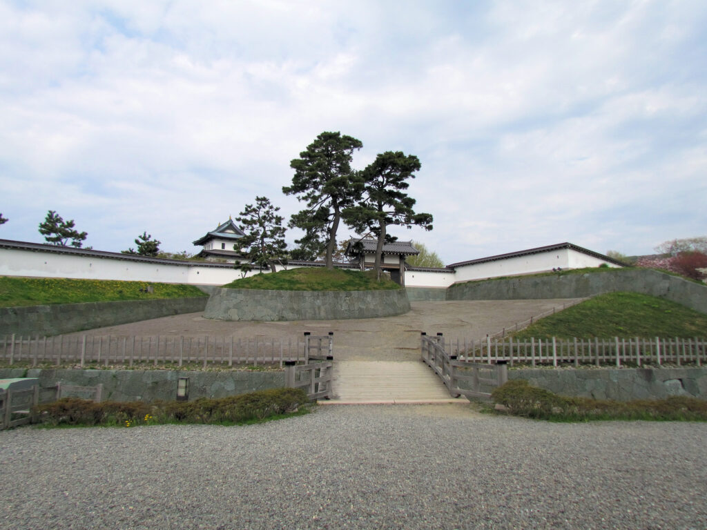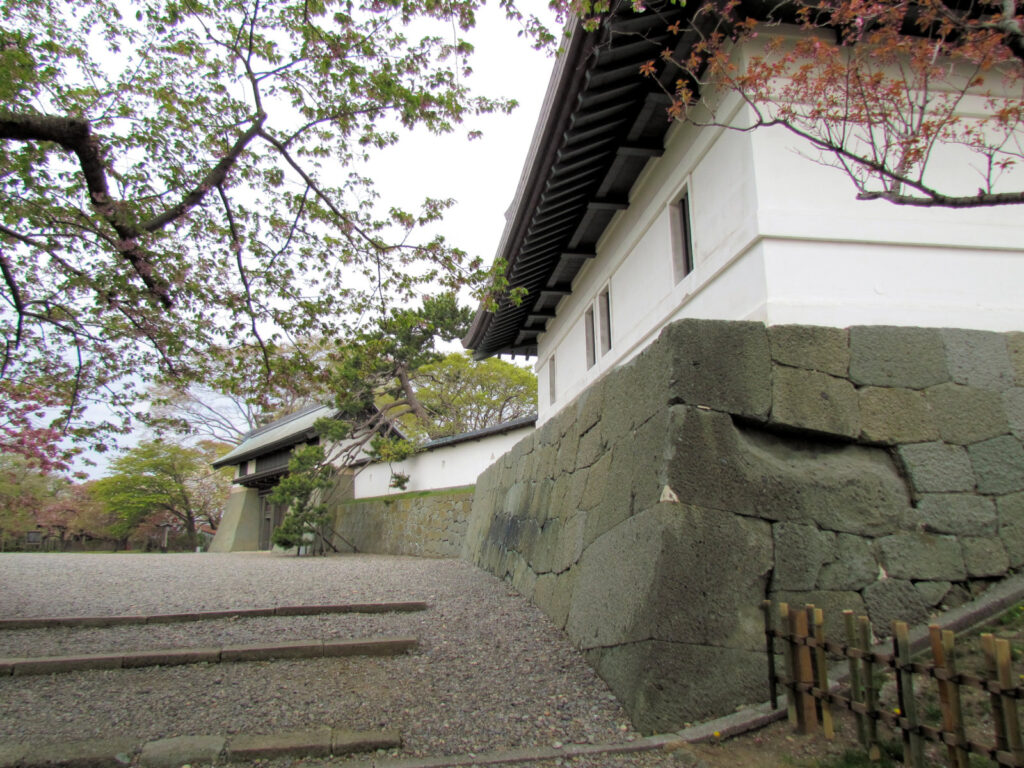 天守前広場を出ると、修復が完成した搦手方面へ進みます。2年前の道南オフではまだ出来ていなかった搦手二ノ門の白土塀も完成してますし、その奥の天神坂門(搦手二ノ門とほぼ同じ形)やその周りの石垣もきれいになっていました。天神坂門の手前には台場(砲台)が復元されていました。天神坂門の写真を撮るのも苦労しましたが、台場は桜見物をして疲れたおばさんがどっかりと座り込んでましたので、写真を撮るのはやめました(^^;)