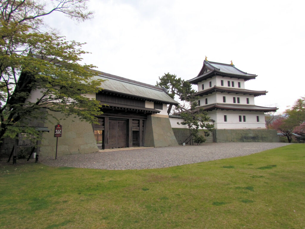 次の日の朝、もう一度松前城に行きました。まだ時間が早かったので、搦め手門付近をもう一度写真に収め、天守の北側にある阿吽寺の方に行きました。そちら側にもところどころ石垣が残っており、もうすっかり埋まっていましたが堀跡もありました。阿吽寺の山門は松前城の旧寺町御門の移築ですが、2年前には赤いトタンで葺いていた屋根を焦げ茶色のトタンで葺き直し、以前に比べると落ち着いた感じになっていました。そして今度は寺町の方に行き、松前家墓所を少し見て天守の方に戻ると、開館していましたので、早速中に入りました。天守内の展示はさあっと見て外に出ると、早速本丸表御殿玄関を見に行きました。