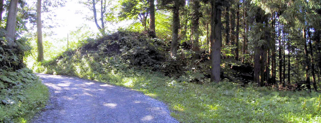 東側に土塁と空堀があるということなので、もう一度車の所まで戻ると、先ほどの裏参道側の裏口の両側に土塁が伸びていました。内側から見るとわかりにくいですが、外側から見るとかなり高い土塁が両側に向かって伸びています。