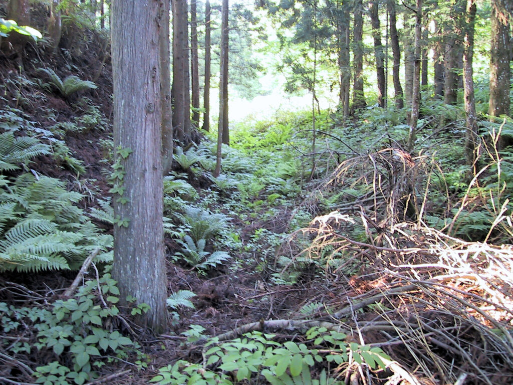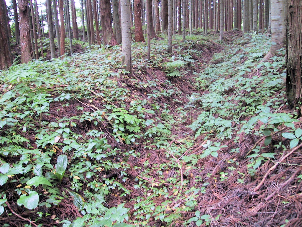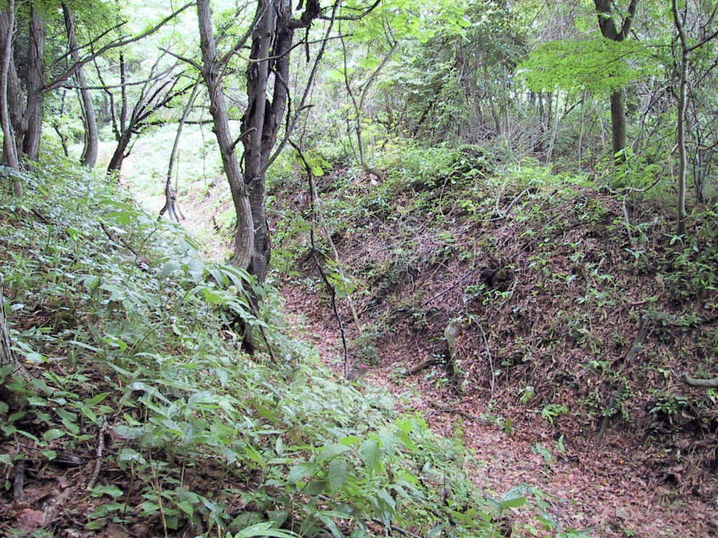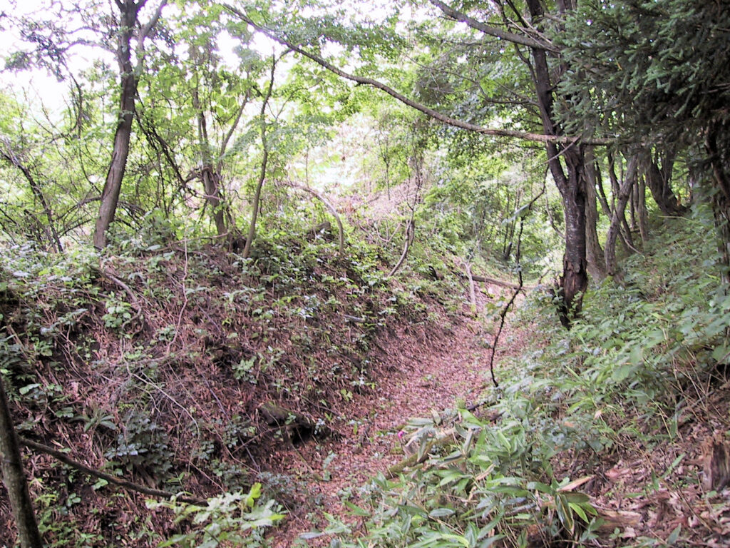 その後、先ほどの堀切まで戻り、今度は大館の方に向かいました。細い道の右側には曲輪らしき削平地が広がり、左側には大きな沢が広がり、その下の方に道が見えます。これが大手道だったようです。