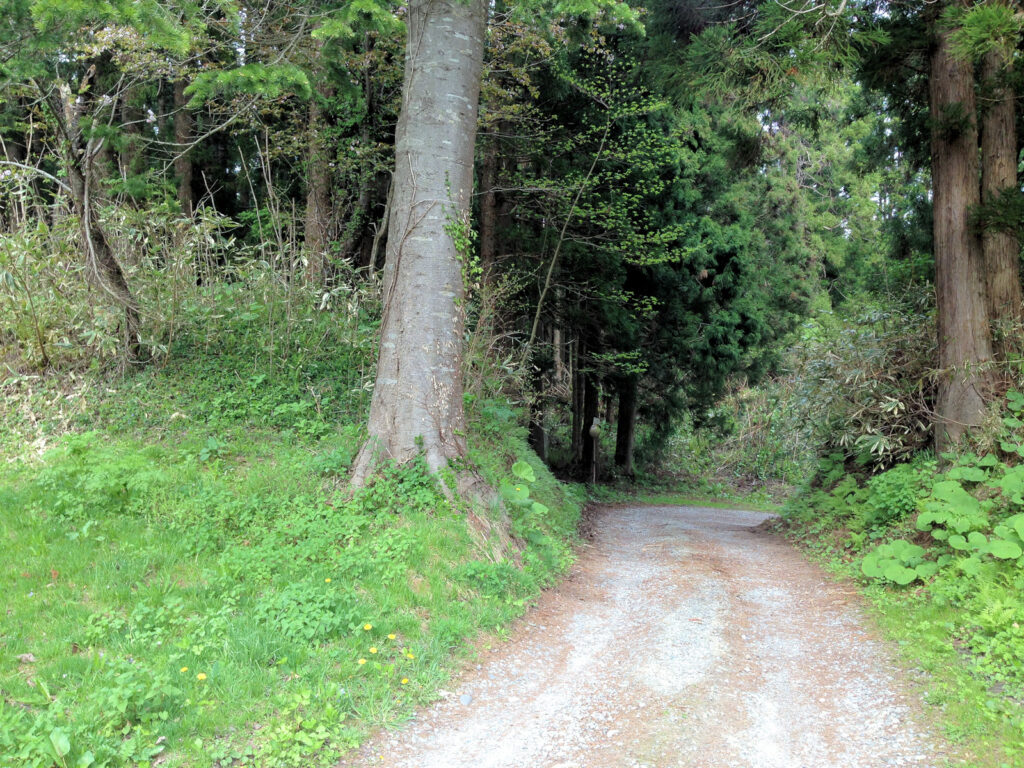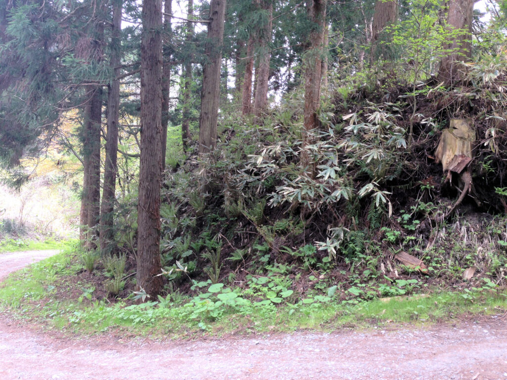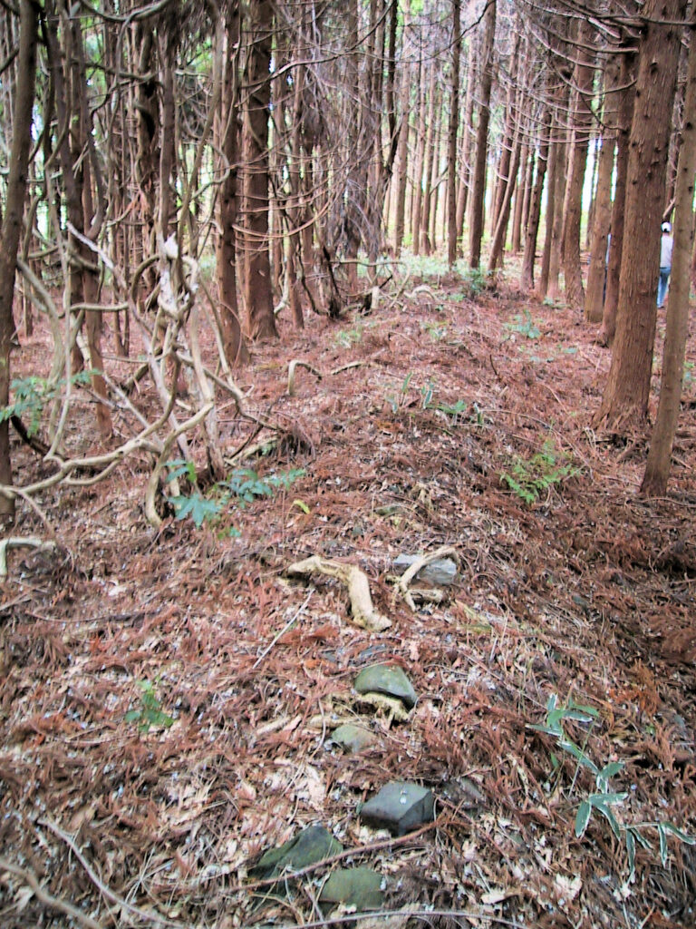 しばらく道なりに進むと、急に広くなり大館の主体部に到着! が、なんとそこに広がっていたのは畑...(^^;) その奥に進むとそちらには植林された杉林が広がっていました(T_T) 杉林のあたりに土塁のようなものがあり、その上には石がずっと敷いてありましたが、あれは屋敷跡のようなものだったのでしょうかねえ? そのあと、しばらく進みましたが、この大館の広さにはほんとビックリしました。小館だけでも充分な広さがあると思いましたが、大館はその10倍ほどもありそうな広さです。