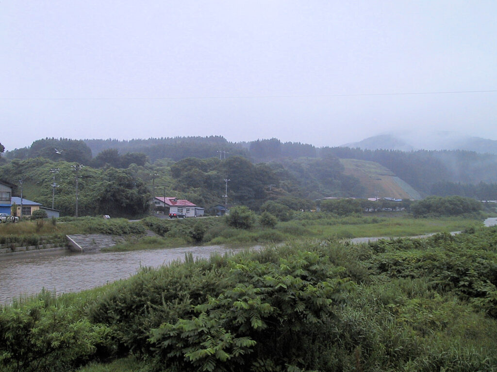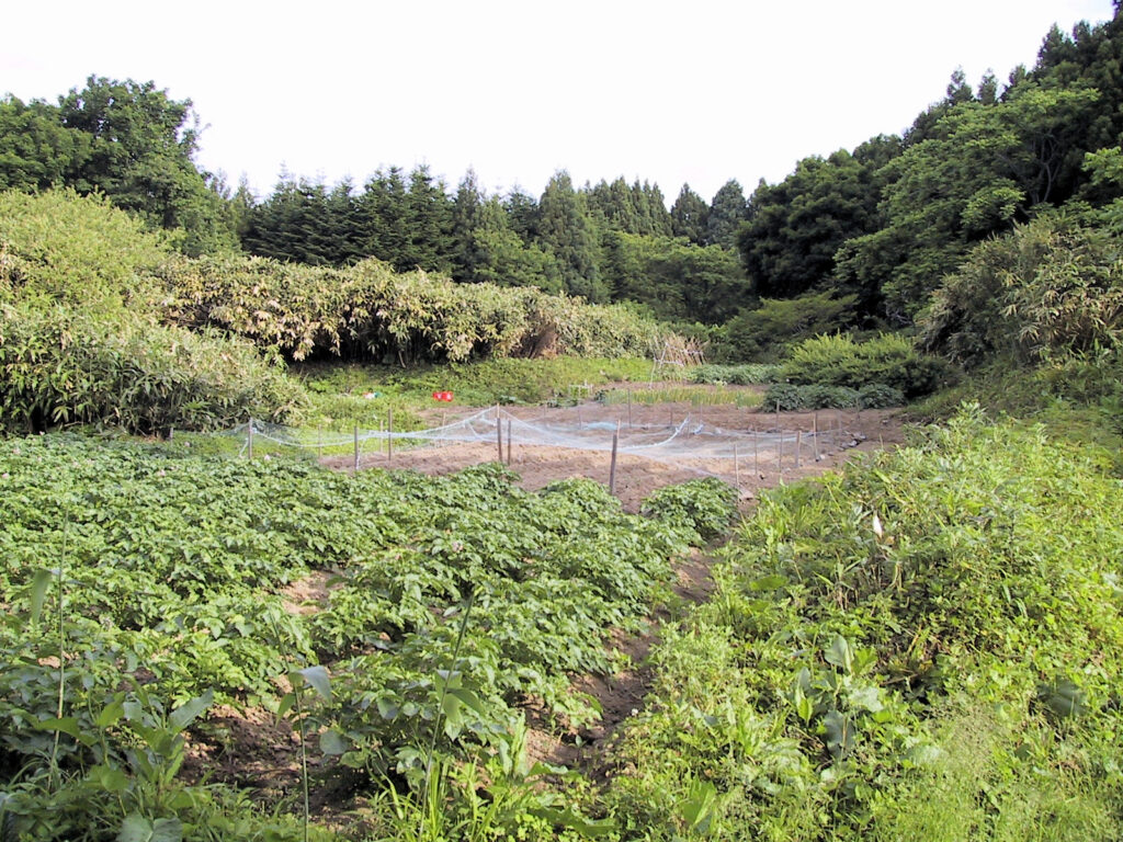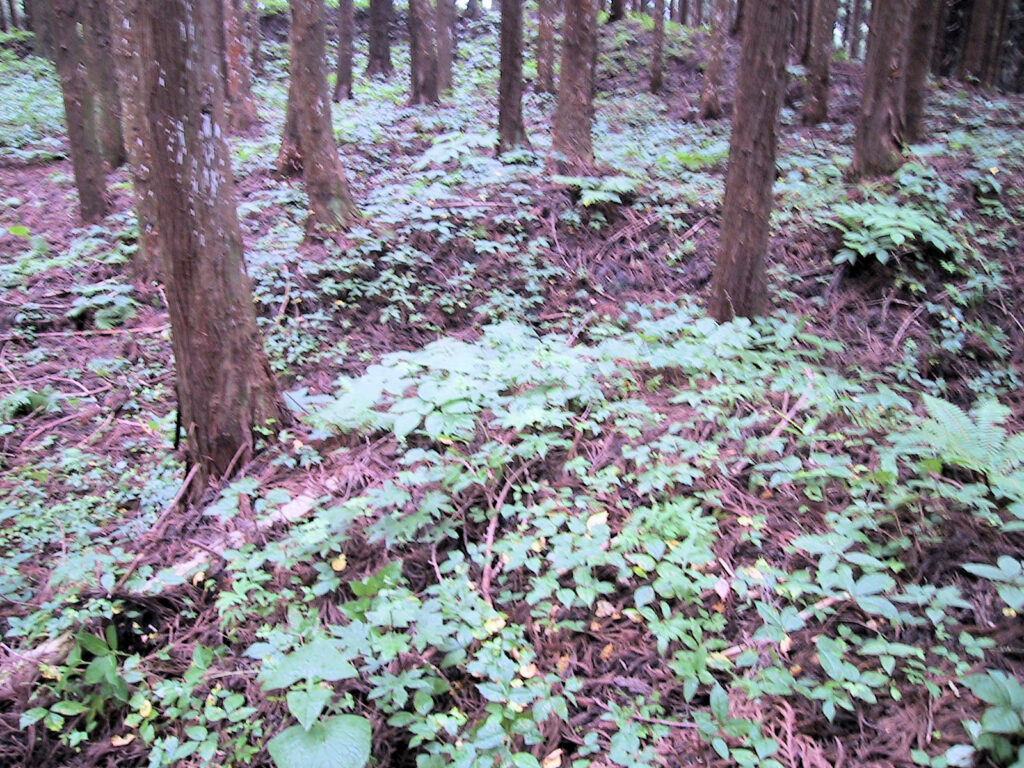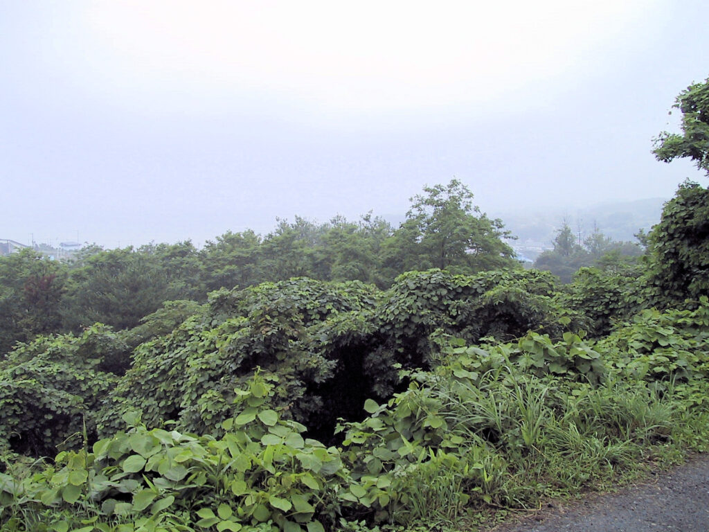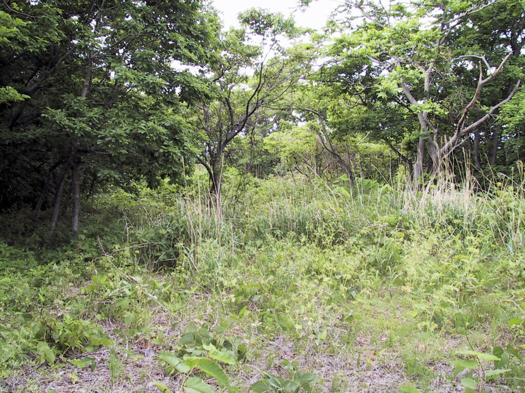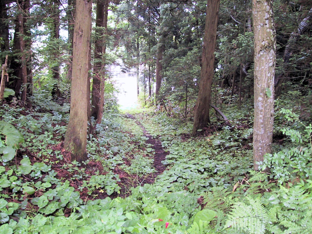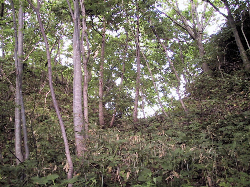 大館と小館の間を左の方に入っていきましたが、藪、藪、藪... 途中に倒木もあって藪こぎ初心者の私としましては参りました。何とか到達した目的地の上に立って土塁の写真を撮ってみましたが、ただの草藪の写真にしかなりませんでした(^^;) そのあと上磯の奥にある盤の沢を案内していただいたり、富川塁まで突入していただいたり、今回は本当に落合さんにお世話になりました(^^) (2001/7/30)