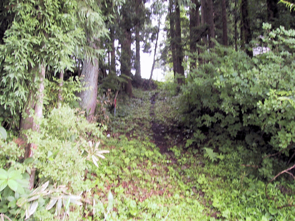 また、裏参道に続く部分が空堀になっており、草が生い茂っていましたのでそちらには進みませんでしたが、かなり大きなものです。社殿の裏側の方から見てみると、小館との間が急な崖になっており、深さ(高さ?)は十数mはありそうでした。(2000/8/11)