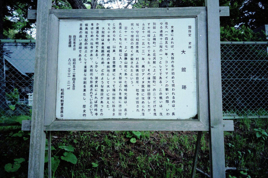 松前に着いたのはもう5時頃でしたが、まだ明るいのでまずは大館跡へ行ってみました。ここは松前に行くたびに行ってみるのですが、未だに徳山大神宮前に立っている説明板しか発見できません。未だ発掘調査などが行われていないのでその全貌は明かではありません。今回も登り口などが無いかなあとちょっと探してみましたがよくわかりませんでした。(2000/8/11)