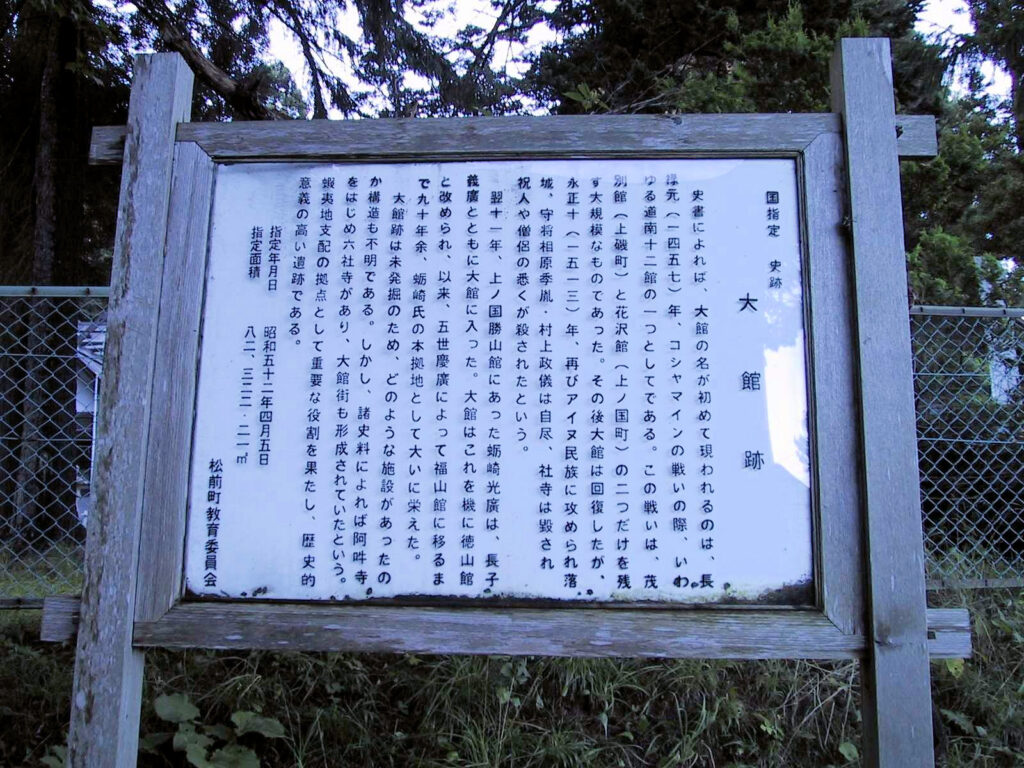 永正9年(1512)、アイヌの攻撃により陥落、両守将は戦死しましたが、これは蠣崎氏二代光廣の策謀によるものと言われています。そして同11年(1514)光廣は上ノ国から大館に移り、徳山館と名を改め安東氏の代官として蝦夷地支配をを進めました。その後もアイヌの攻撃がありましたが、慶長11年(1606)に福山館(松前城)に移るまで蠣崎氏政権の拠点でした。その後は万一の場合の隠し砦としてそのまま保存され、現在に至っています。