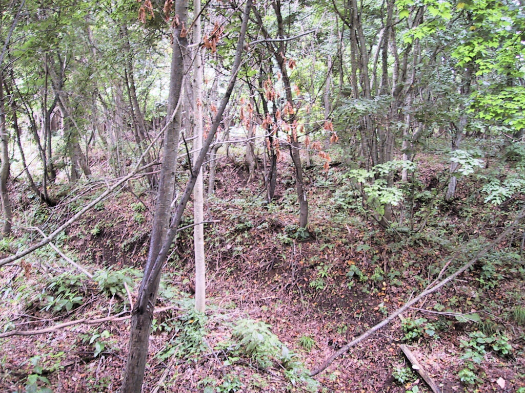 土橋から眺めると、第三の壕の内側に第一・第二の堀がセットのように並んでいました。この第一・第二の堀は伊達市にある館山チャシの堀と雰囲気が似ていました。丁度堀の草も刈られていたようでとても見えやすかったです。落合さんの話では最初は内側の二本だけで第三の堀は跡から付け足したものではないかとおっしゃっていました。