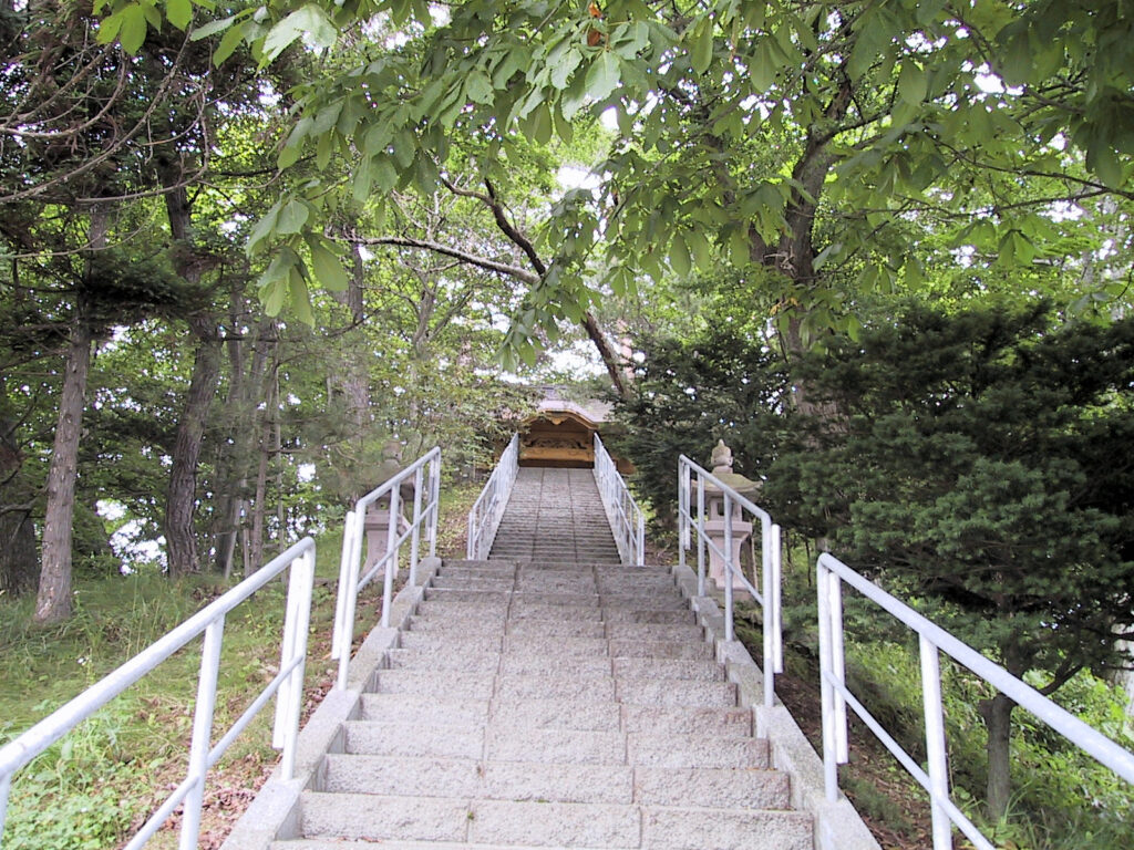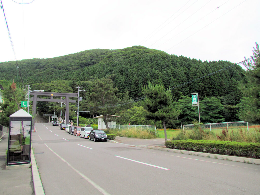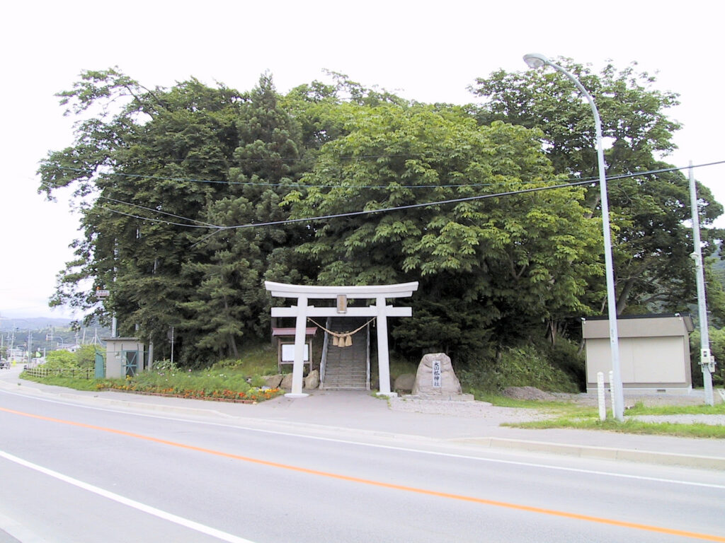『北海道のチャシ』では「遺構未確認」とあるとおり、現在では神社の境内となっており遺構らしき物はありません。位置的にはちょうど汐泊川がカーブしている角にあり、漁労の見張り場としては適当な位置にあったといえるでしょうね。