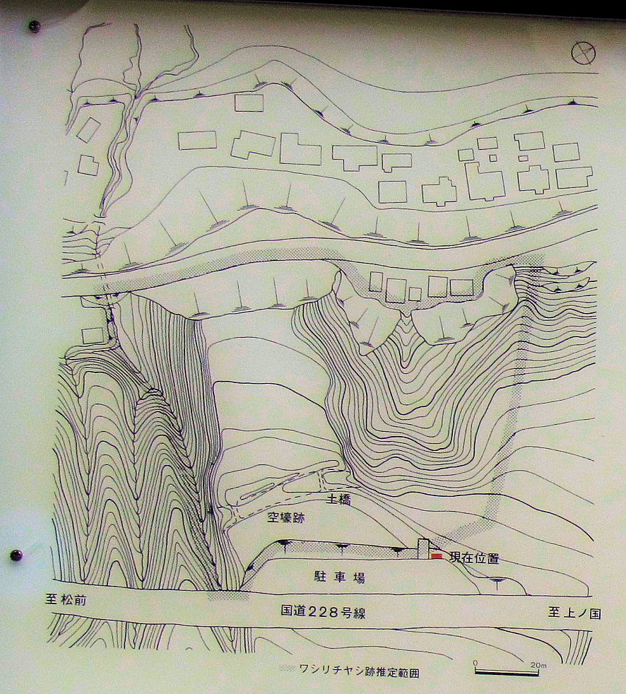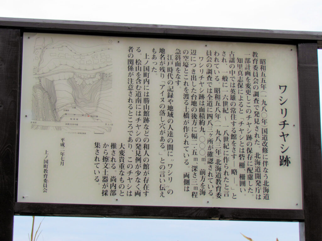 3年ぶりの道南旅行二日日、松前城を巡り、松前をあとにして上ノ国へ向かいました。過去何度も草だらけで何も確認できなかったワシリチャシ、今回もたいして期待していませんでしたが、取りあえず…という気分で寄ってみました(^^;) ワシリチャシの説明板は以前のままでしたが、説明板にある平面図に従って空壕跡の方に行ってみると、草が伸びていてわかりにくいですが空壕らしきものがありました。その部分だけ草の色が違いますし、若干窪んでいるような感じがしますので間違いないと思います。