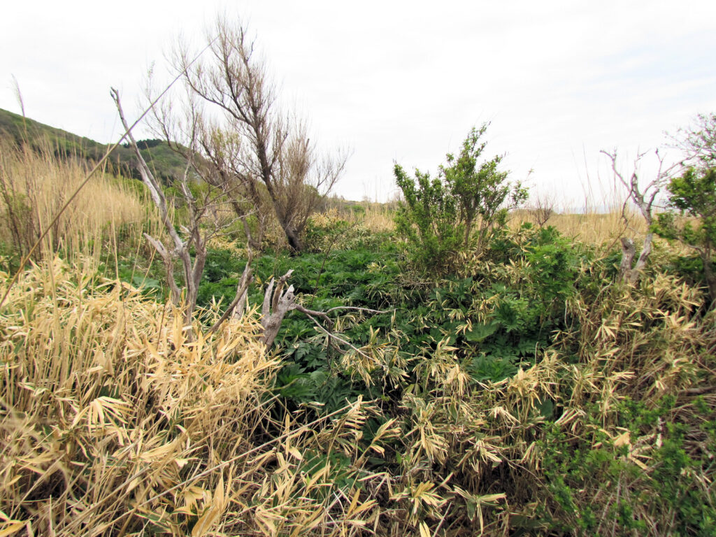 その後、石崎から少し北の汐吹にあるワシリチャシを探しました。すると国道から汐吹の集落に降りていく分かれ道を少し通り過ぎた左側に駐車場がありそこにワシリチャシの説明板がありました。どうやらチャシはその駐車場の海に面した側にあるようですが、草が伸びていて全く遺構は確認できませんでした。説明板によると幅2.5m、深さ3mほどの空壕とそれを渡る土橋があり、両側は急斜面によって遮られているそうです。