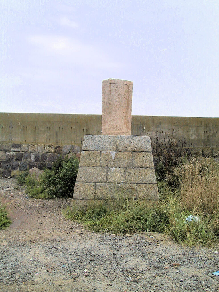 この標柱から少し離れた函館漁港近くに「函館港改良工事紀念碑」が立っていますが、この記念碑の石は弁天台場のアゴ石に使っていたもので、備前産の御影石のものだそうです。(2001/7/29)