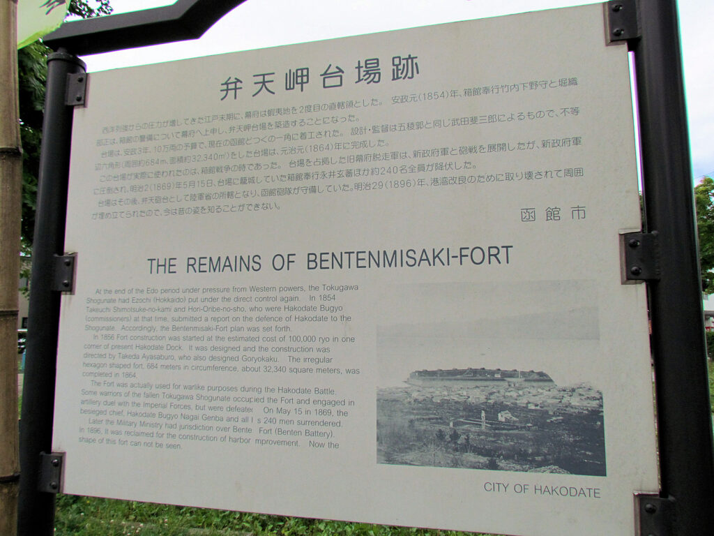 箱館開港による外圧に備えるために、安政3(1856)年からから7年の歳月を費やして海面を埋め立て、石垣を築きました。設計監督は五稜郭と同じく武田斐三郎で松川弁之助と石工喜三郎が工事を担当しました。不等辺六角形で総面積が約1万2000坪、高さ11.2mで備砲は大小あわせて16門といわれますが実数ははっきりしません。この台場も箱館戦争の戦いの場となり、明治2年(1869)5月11日、新政府軍の奇襲攻撃に敗れた市中警備の兵が台場に入り込んだため、給水・食料に窮し五稜郭に先駆けて5月15日に降伏しました。