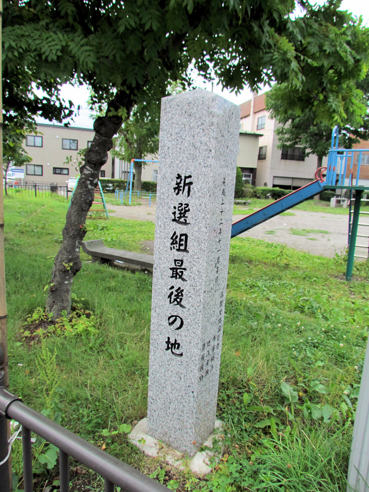 五稜郭に行ったあと、元町方面に向かい北島三郎記念館でしばし遊んできました(^^;) そのあとちょっと函館どつくの方に行きました。すると左手に見える「入舟児童公園」というトイレのある公園の一角に弁天台場の説明板があります。そのすぐ近くには「新選組最期の地」という石碑も。それから、そこから斜めの道を進んだところにある函館どつくの裏門前に標柱があります。
