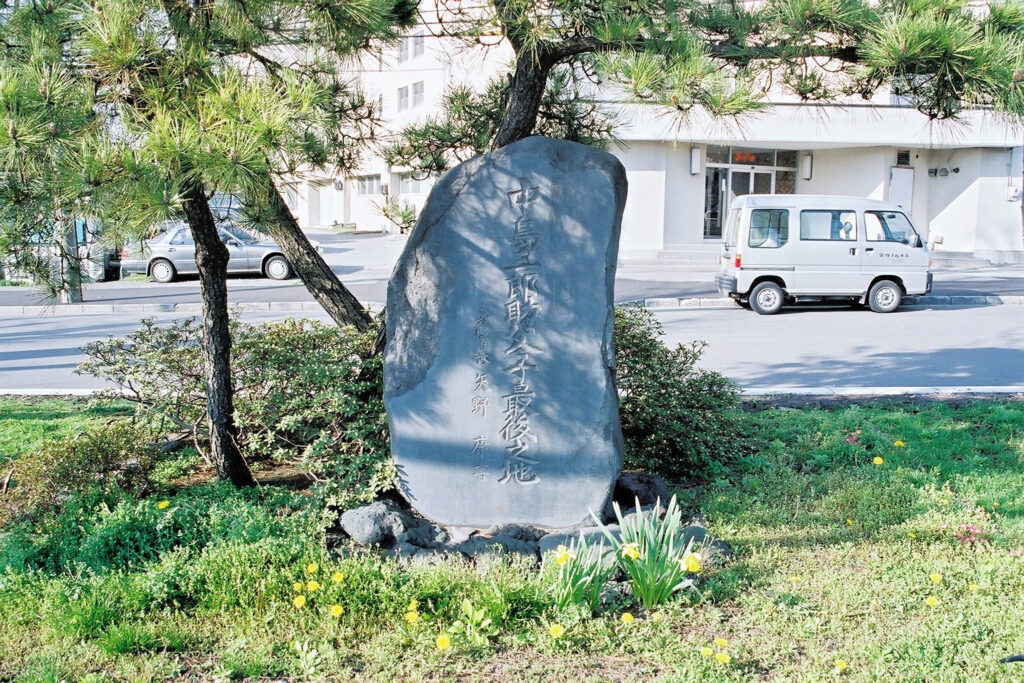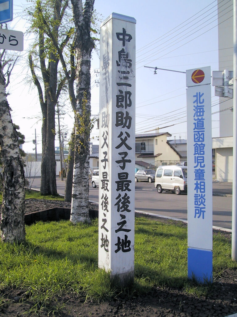 五稜郭から今度は立待岬に行こうとした途中で、この千代ヶ岡陣屋の隊長として守備をした中島三郎助父子最後の地の碑を見つけました。解説板によると中島三郎助は長崎海軍伝習所の第一期生で、のちには軍艦操練所教授方を務め、維新後は榎本と行動を共にし千代ヶ岡陣屋隊長になったそうです。中島父子は新政府軍の降伏勧告を謝絶し戦闘を続け、長男恒太郎・次男英次郎とともに戦死したそうです。