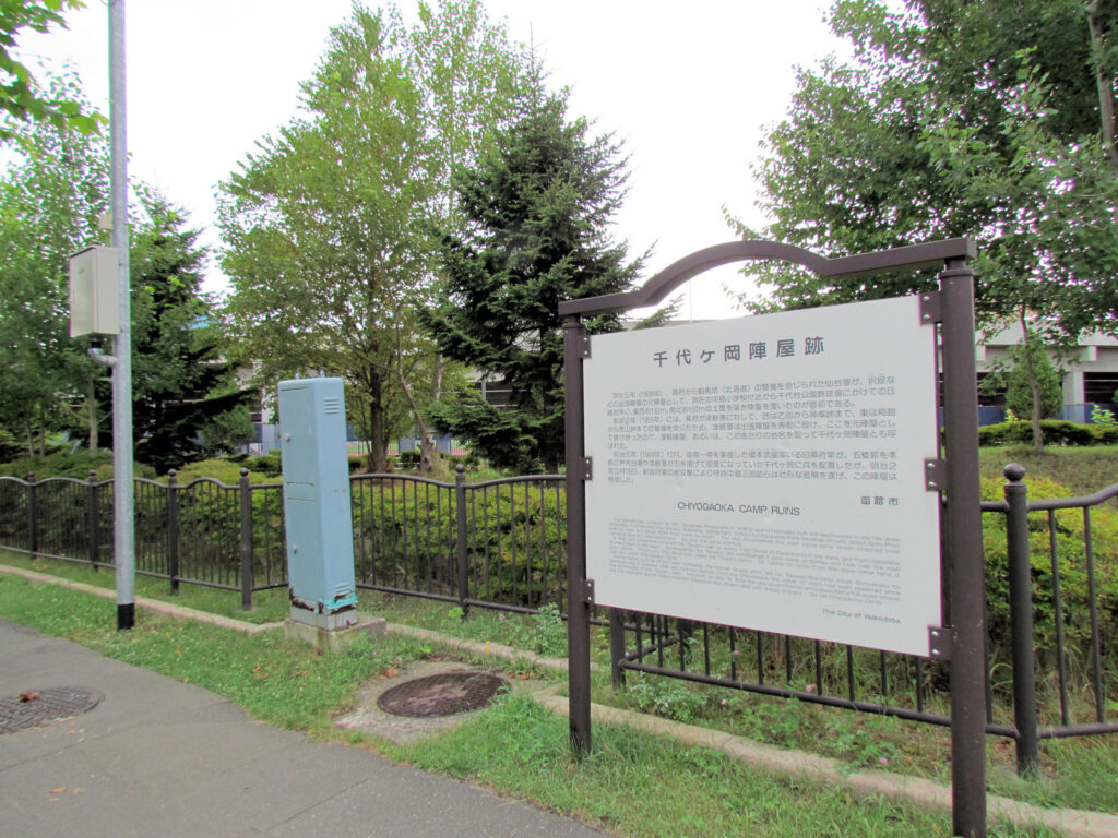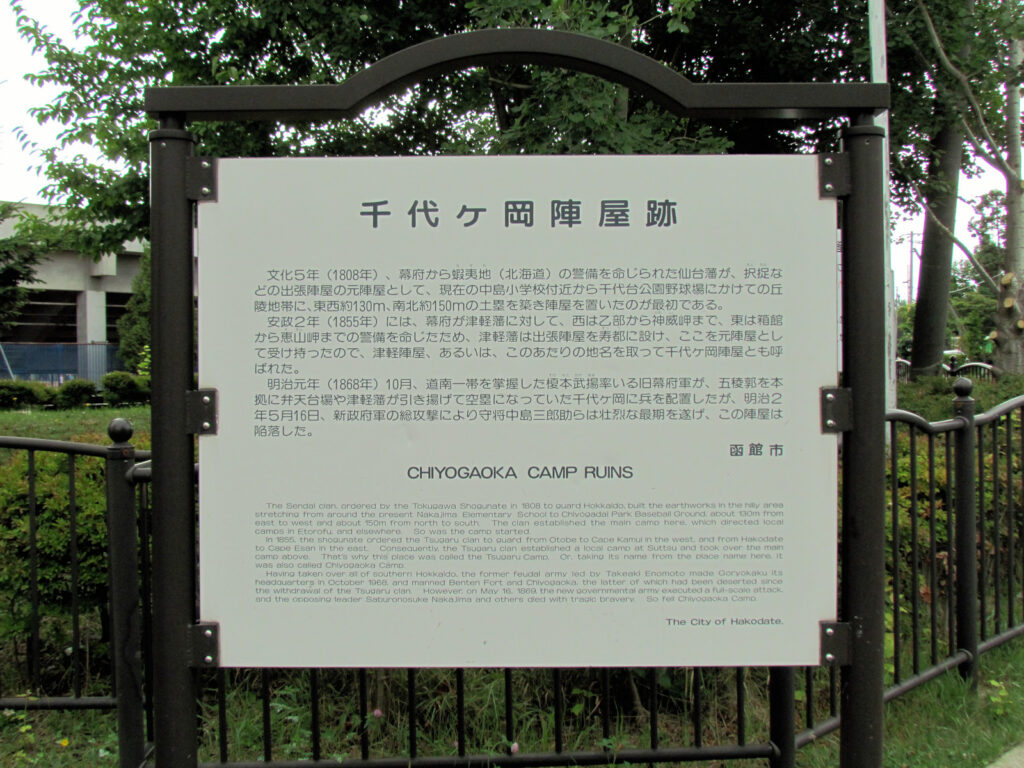 ここは幕末に津軽藩が蝦夷地の日本海側の警衛を命じられた時に置かれた元陣屋で、明治元年に津軽藩が撤退した後、旧幕府軍が兵を置き箱館戦争の際は激戦の地となりました。戦前は陸軍の分屯所等として使用されましたが、現在は千代台公園となり野球場等となっています。