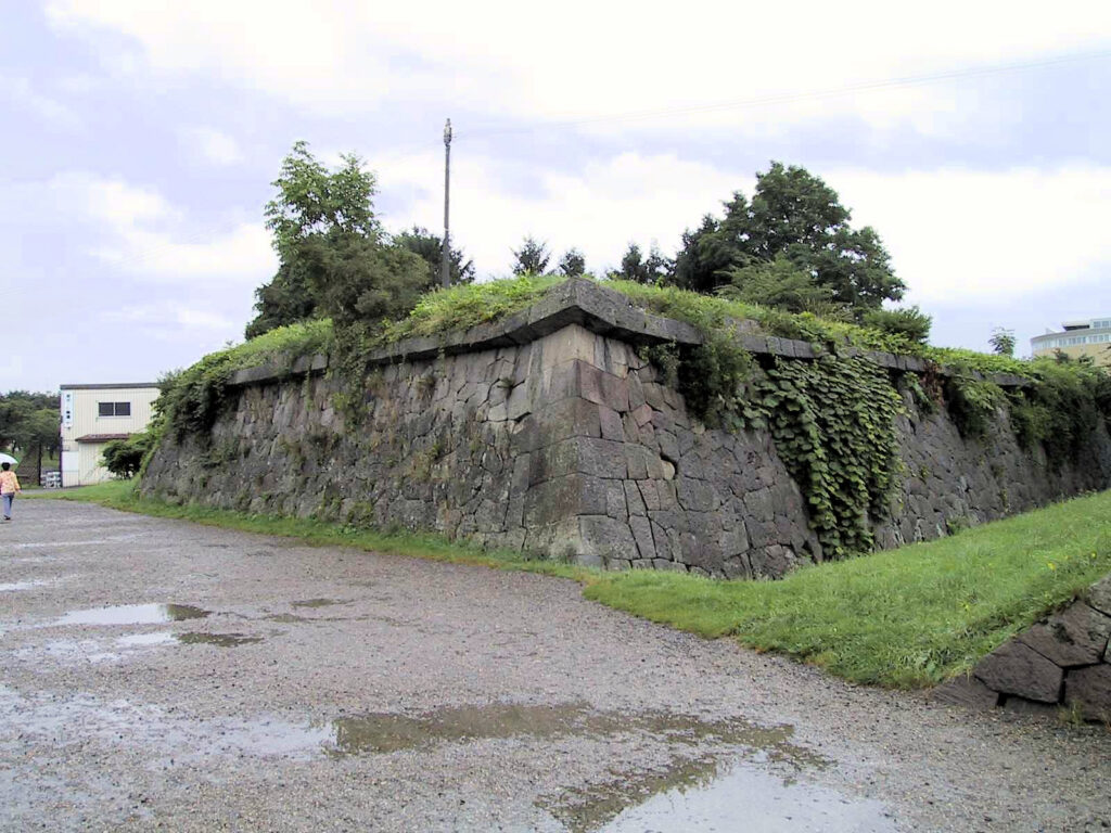 本当はその後壕の外側から五稜郭を眺めてみようかなと考えていたのですが、雨が相変わらず降っていますし、さっきこけたショックがまだ残っていたので(をい(^^;))、中に入って博物館のある方へと進むと、今まで気付かなかったのですが、博物館のある場所を囲むように土塁が残っているのを見つけました。よく見ると土塁の端の方に石垣が残っているところもありましたので、これも遺構なのでしょう。記憶が定かではありませんが、確か現在博物館が建っているところに、箱館奉行所の庁舎が建っていたはずですので、それを囲むように土塁があったのかもしれません。