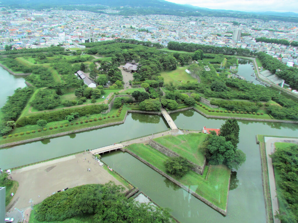 ここは3年ぶりの訪城となりました。前回は登らなかった五稜郭タワーにまず登ってみました。頂上の展望台から見ても五稜星形がはっきりしないのは残念ですが、やはり上から見た方が形がよくわかりますね。