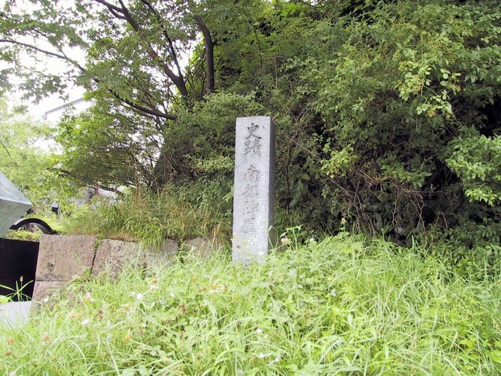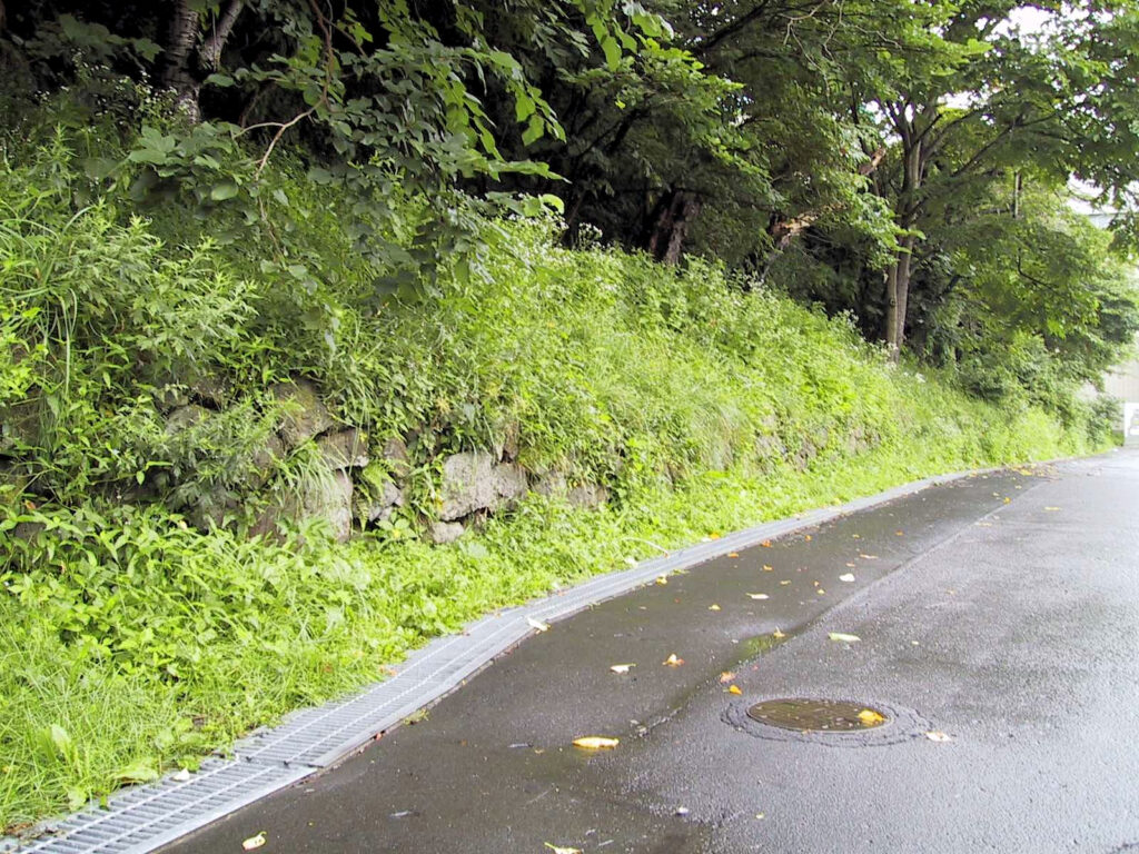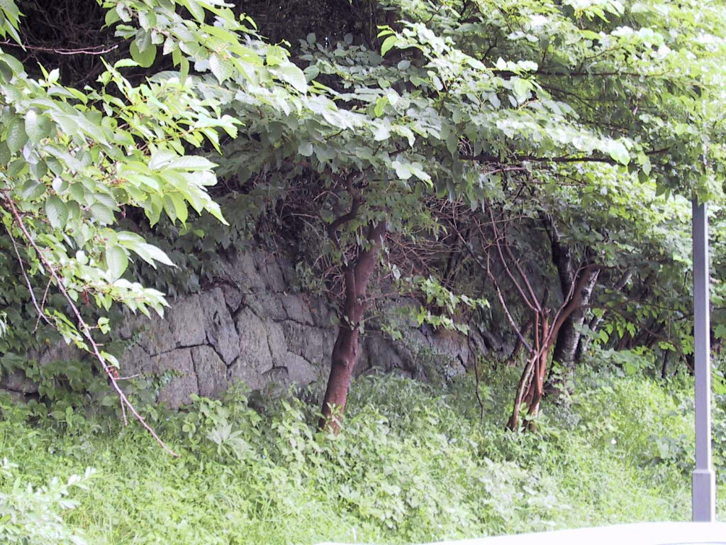 五稜郭をあとにし、次は南部藩陣屋跡へと向かいました。この陣屋は函館山ロープウェイの山麓駅の斜め向かいにあると『北海道の歴史散歩』にあったので、ロープウェイ乗り場近くの駐車場に車を停め、山麓駅の周辺を探してみました。すると「南部藩陣屋跡」の説明板・石柱がすぐ見つかりました。またそのすぐ横の壁面には石垣が広がっていました。部分的には何だか新しそうだなと思えるものもありますが、古そうな石垣が残っている部分もあります。