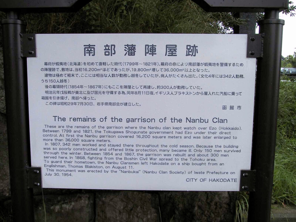 二回目は安政2年(1855)で、箱館市内の弁天岬等の警備を命じられた南部藩は陣屋を再築し、210人ほどの兵員を配置しましたが、明治元年(1868)南部藩は旧幕府軍襲来の噂と政情不安から蝦夷地警備兵を撤退させることとし、陣屋に火を放って帰国し、陣屋は廃されました。