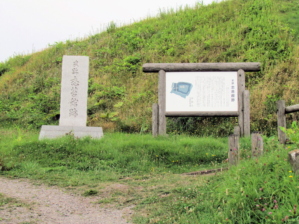 志苔館はいわゆる「道南十二館」の一つで、ここの館主小林氏の祖先は上野に住し、次郎重弘の時に蝦夷に渡ってきたそうです。一説には、徳治元年(1306)に小林重弘が津軽から渡って築城したともいわれます。長禄元年(1457)のコシャマインの戦いの際は、重弘の孫・小林良景が館主でしたが、アイヌの攻撃で落城しました。その後再築され良景の子弥太郎良定が館主となりました。しかし、永正9年(1512)のアイヌの攻撃で再び落城し、良定は戦死しました。