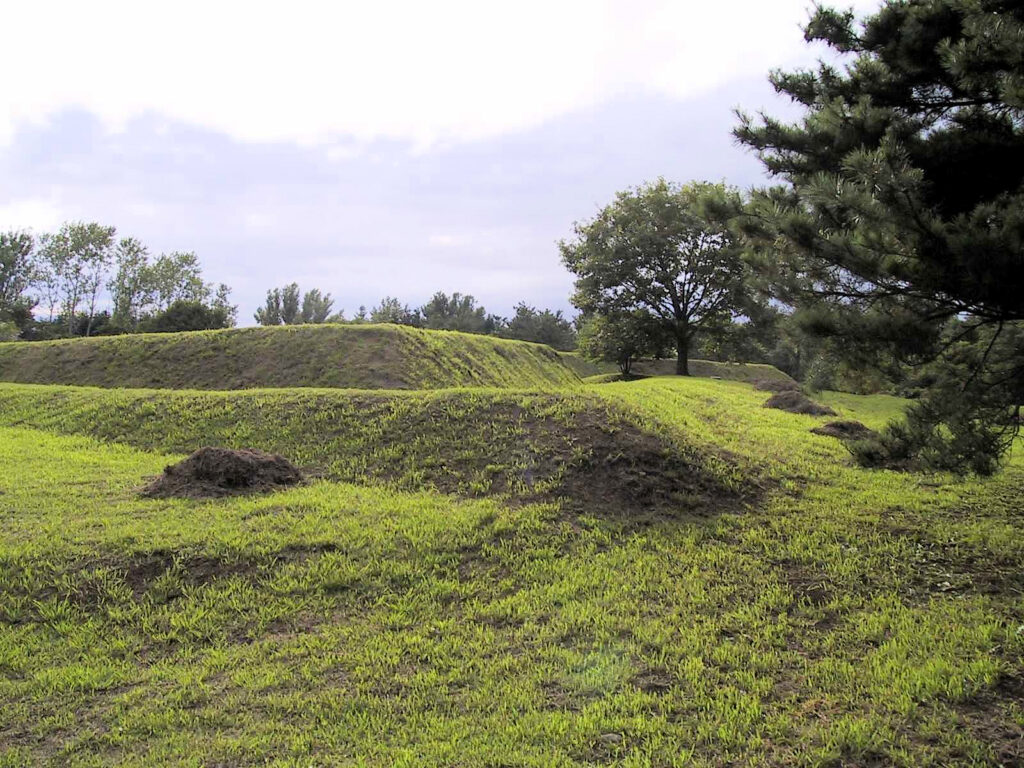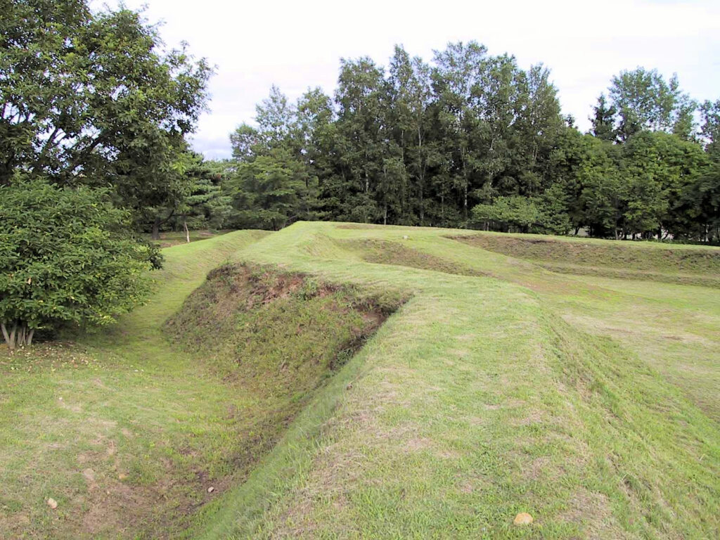 ただ土塁はあとから整備もしたんでしょうけど、とてもきれいです。土塁好きの方にはおすすめでしょう(^^;) 特に四隅の砲座の所に立って土塁を眺めると、その屈曲がよくわかりますし、写真に撮るとなかなか見栄えがします。