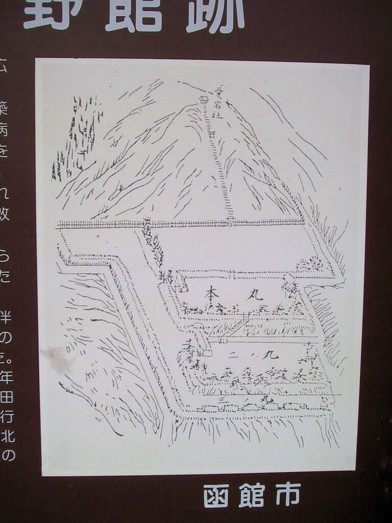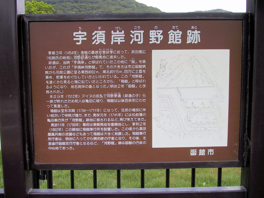 享徳3年(1454)、安東政季に従い武田信廣、河野政通らが蝦夷地に渡来しましたが、政通は当時「宇須岸」と呼ばれていた現在の函館の地に館を築きました。その後、長禄元年(1457)のコシャマインの戦いの際にはアイヌの攻撃により陥落し、その後復興したものの、再び永正9年(1512)アイヌの攻撃によって政通の子季通が敗れたため、和人は亀田に移り箱館は以後百余年にわたって衰退しました。
