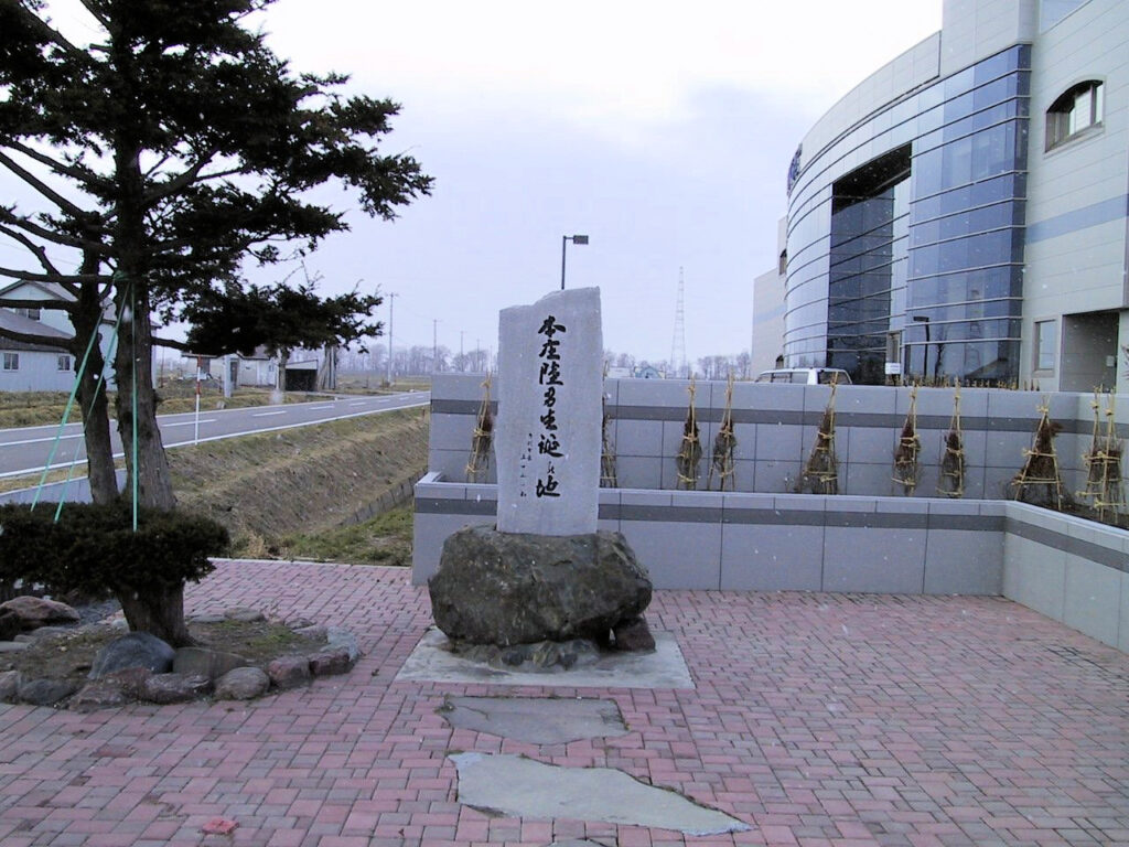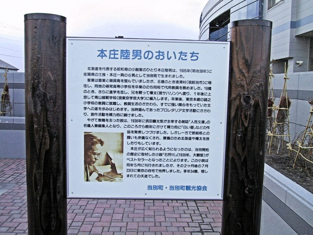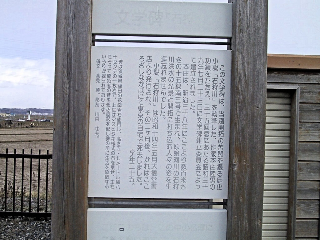 札幌のあいの里から当別町方面へと石狩川を渡る札幌大橋の当別側の堤防の上にちょっと変わった形の記念碑が建っていますが、これは本庄睦男の文学碑です。本庄睦男は当別町の出身で、当別の開拓に取り組んだ仙台藩伊達家一門・伊達邦直家中の苦闘を描いた名作『石狩川』が知られています。この碑は本庄の功績をたたえ、昭和39年にたてられたものです。その近くのロイズ工場の横には本庄睦男誕生の地碑もあります。