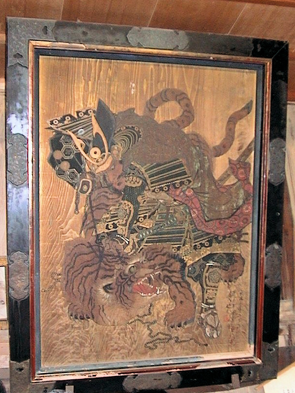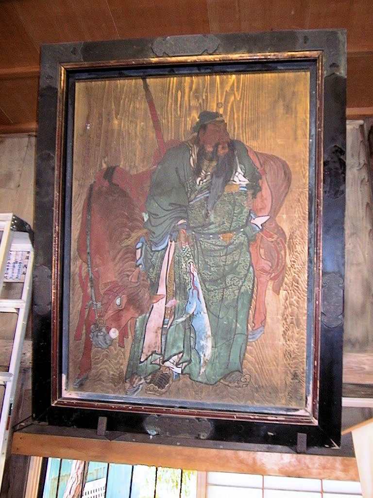 内部には「関羽正装図」「加藤清正虎退治図」「老武将図」など江戸後期に奉納されたらしい大絵馬額がかかっていました。また、文化年間に奉納された鰐口、天保年間のものらしい「妙亀法鮫大明神」の神額などがありました。