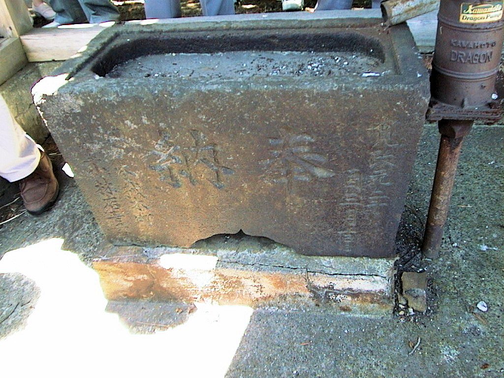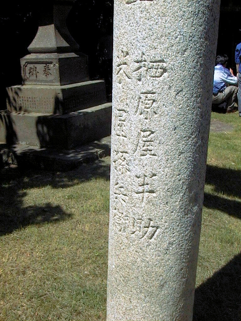 ですからその鳥居はもともとは弁天社のもので、文化年間に建立されたものです。よく見ると、場所請負人である栖原屋・米屋の名前が刻まれています。八幡神社の手水鉢も、実は弁天社時代のもので寛政元年の文字が見えます。また境内には木戸孝允筆という灯籠石が残っています。