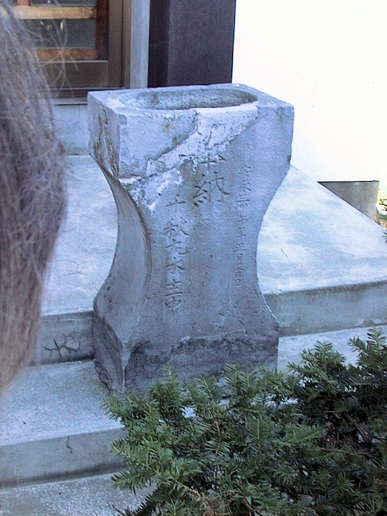北海道東北史研究会石狩シンポジウムの巡検、八幡神社の次は金龍寺です。この寺は当時の幕府石狩役所調役・荒井金助が弟・栄太郎の菩提を弔うために建立したと言われています。ここにも弁天社の手水鉢が残っています。安永3年(1774)に奉納されたもので、石狩市内最古の石造品だそうです。「千秋丸水主中」とあるので、船乗り達が奉納したものと思われます。また境内には、幕末の石狩詰役人天野傳左衛門正庸(あまのでんざえもんまさつね)と村田小一郎の墓も残っています。