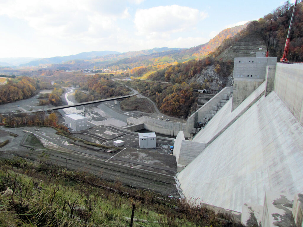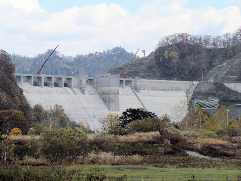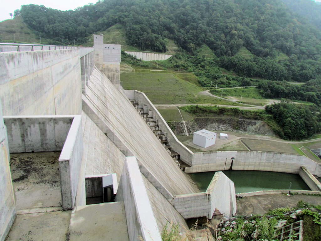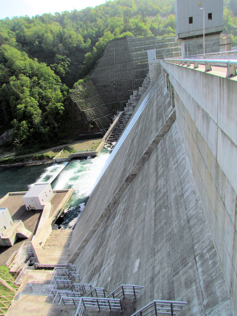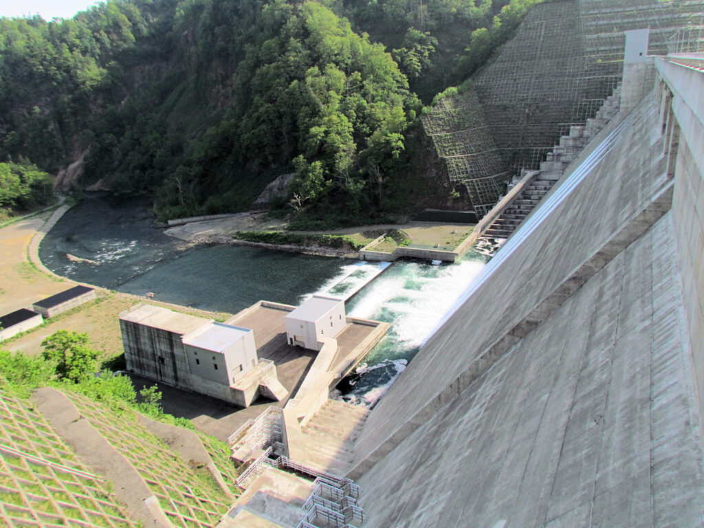 【ダム情報】河川名:石狩川水系夕張川、型式:重力式コンクリートダム、ゲート:クレスト(自由放流)×12門・ジェットフローゲート×2門・高圧スライドゲート×2門・四方水密スライドゲート×1門、完成年:2015年