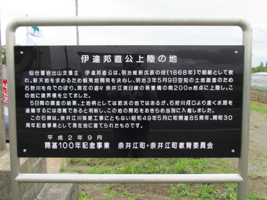 伊達邦直が当別に入植したのはよく知られているところですが、その前に奈井江に探査に来ていたのです。碑の横にある説明板によると、明治3年(1870)5月9日空知の土地踏査のため石狩川を舟で上り、現在の道道奈井江浦臼線の吾妻橋の南200m地点に上陸し、この地に境界標を立てたそうです。5日間の調査の結果、土地柄としては肥沃だが、石狩川河口から遠く、水路で物資等を運搬するのは困難だとして、この地での開拓を断念したそうです。伊達邦直は、その後聚富から当別に入植したことについてはこちらをご覧下さい。