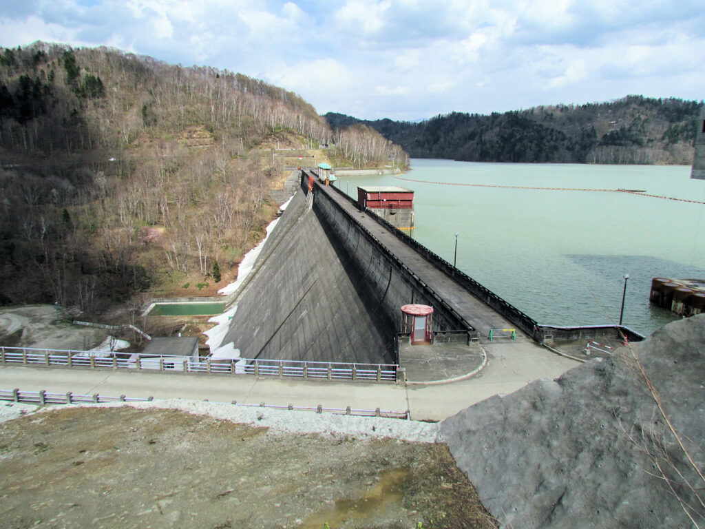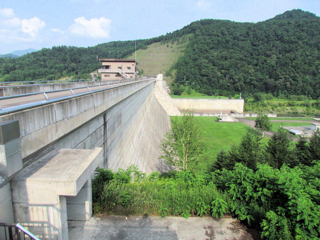 【ダム情報】河川名:石狩川水系空知川、型式:重力式コンクリートダム、ゲート:クレスト(自由放流)×2門・オリフィスゲート×6門・ジェットフローゲート×1条、完成年:1999年