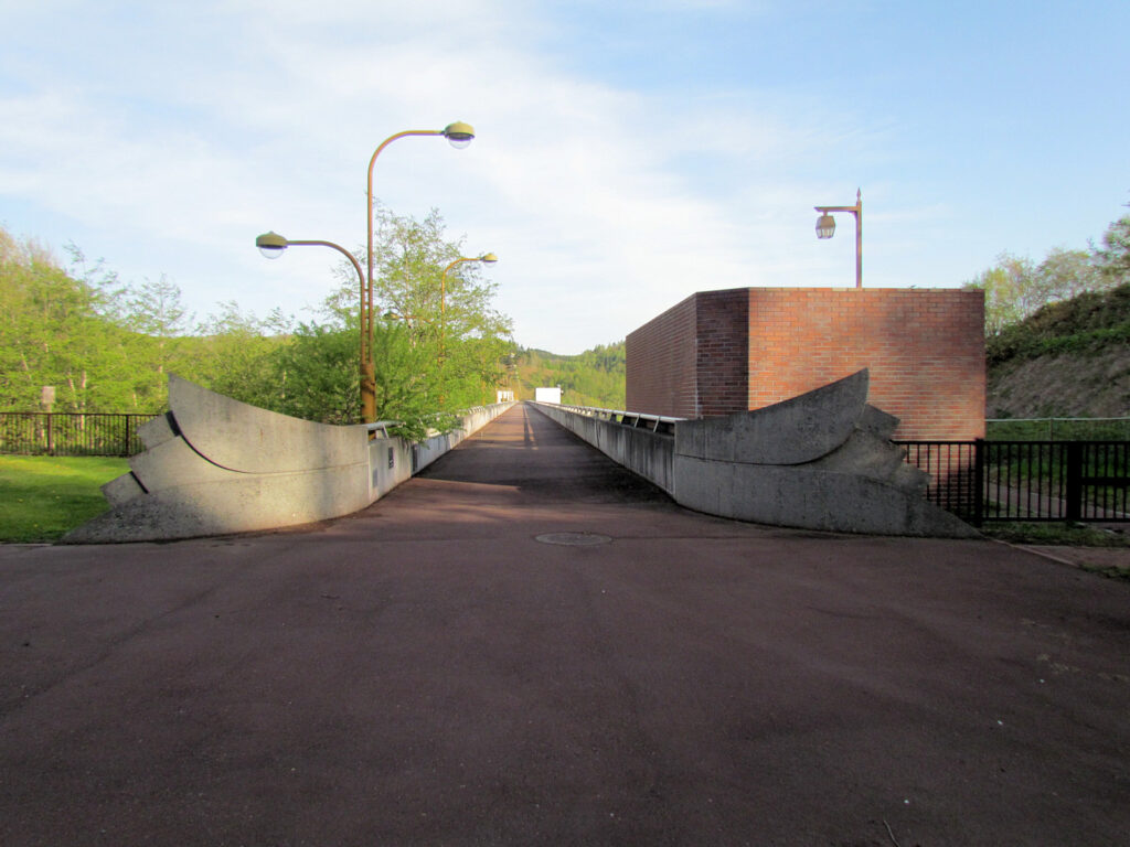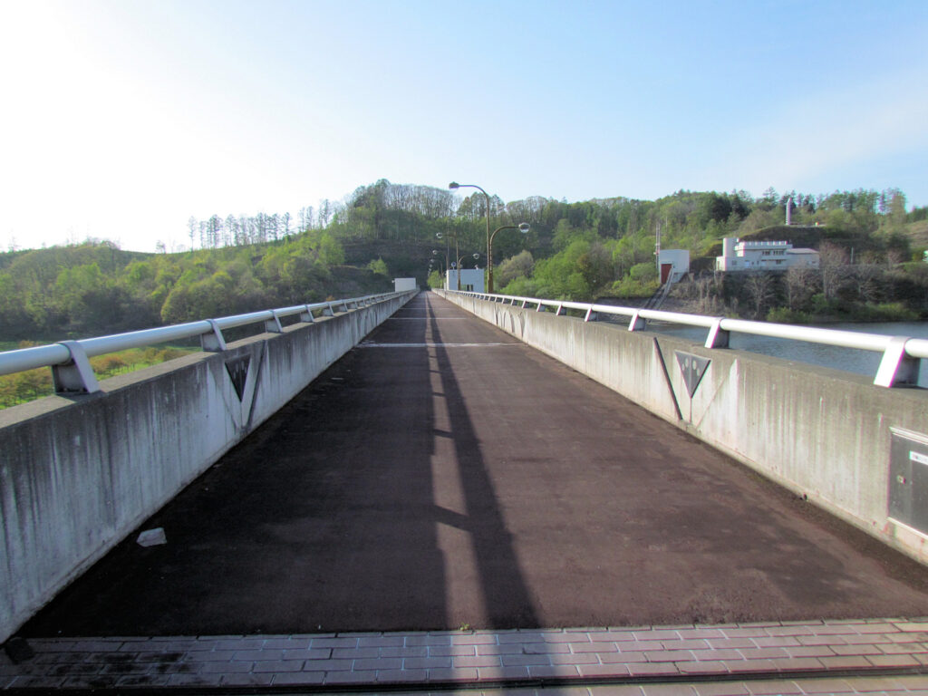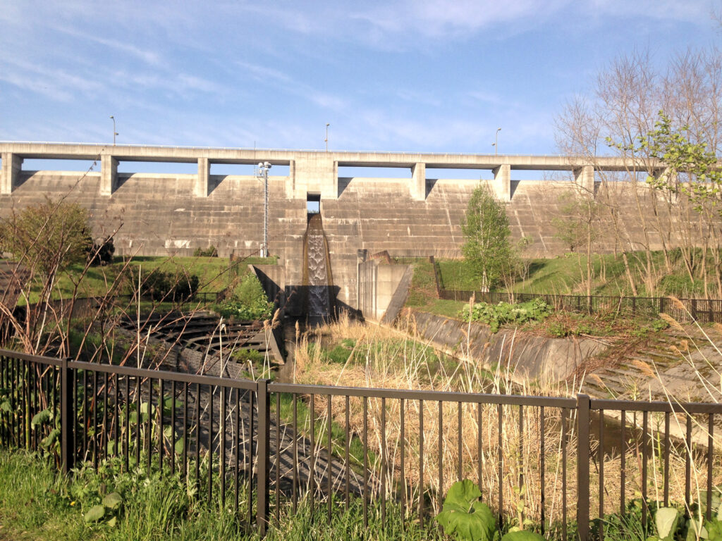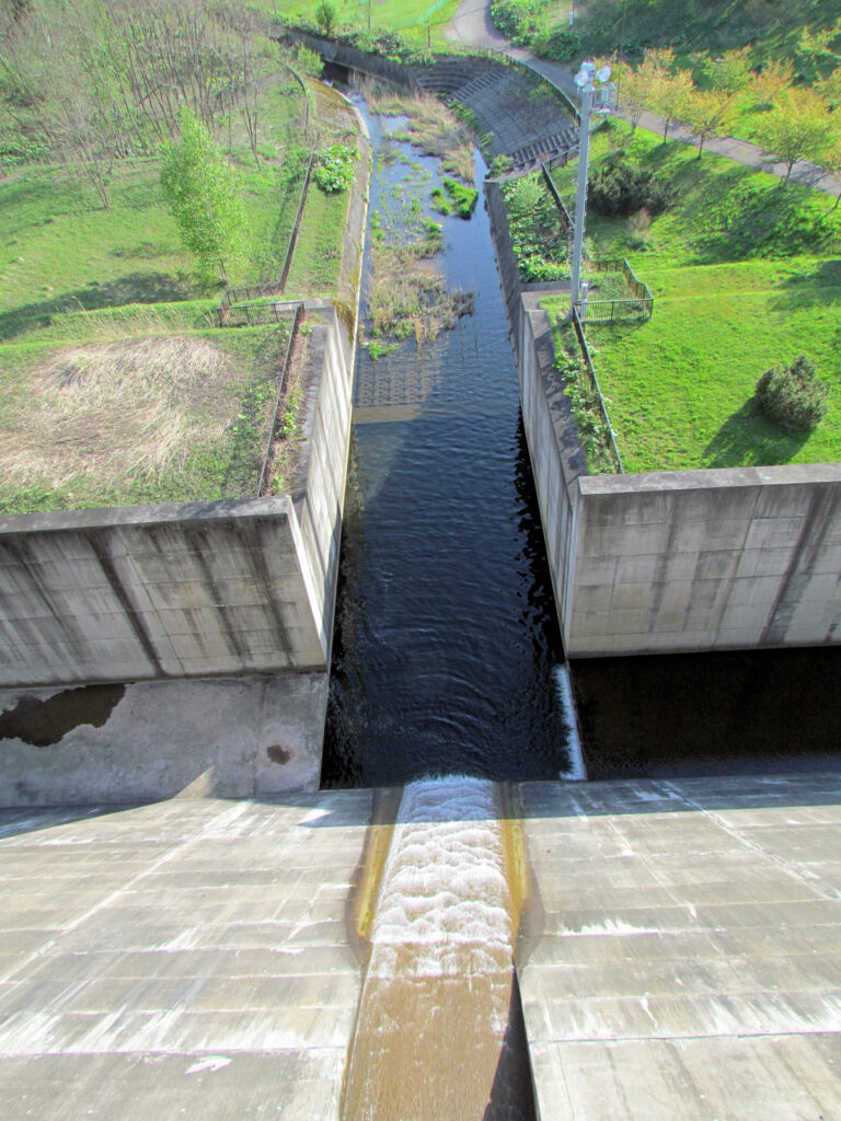 この美唄ダムは2門のクレストゲートを持つダムとして造られましたが、平成12年~16年に行われた施設改良工事によってゲートレス化されたそうです。