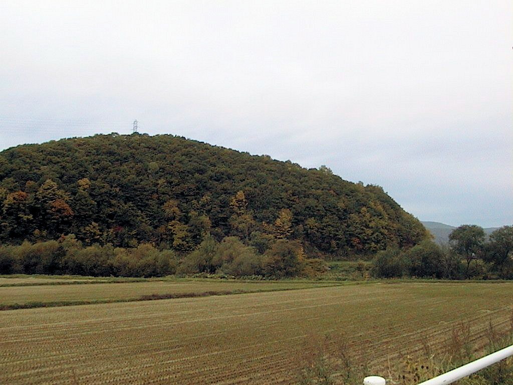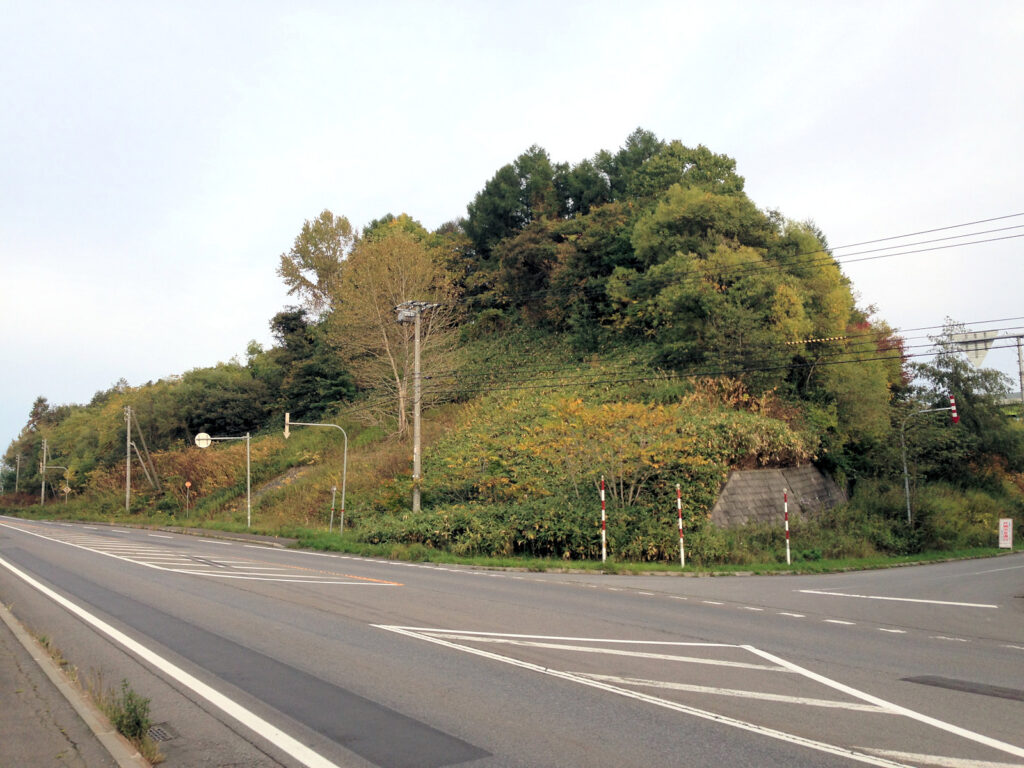 神居古潭をあとにして、少し戻って芦別の方へ抜ける道で左折すると、すぐ前方に右から左へと伸びる台地があります。何の表示もありませんが、「ナイタイベ川下流の蛇行部にあり」という『日本城郭大系』の記述からも、川に向かって伸びる舌状台地の先端という典型的なチャシの立地からも、ここが内園チャシであるのは間違いなさそうです。ただ周囲は農地で、この台地上に登る道もなさそうでしたので、外観を写真に収めるだけで次へと進みました。
