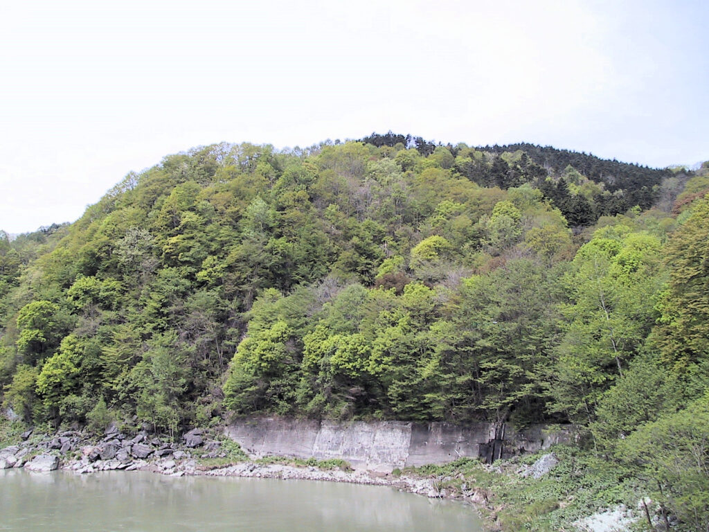 岩がむき出した断崖が次第に近づいてきましたが、道が左右に分かれていたので、まずは左に行ってみました。しかしだんだんと登っていくと、だんだんと道は険しくなってき、断崖の裏側に行けなさそうなので、二股のところまで戻り今度は右の方へ進んでみました。すると途中泥にはまりそうになりながらも、ぐるっと回って断崖の上の方に出ることができました。丁度ここからは対岸にある神居古潭チャシのあるあたりが一望できましたが、残念ながら二重の空壕は発見できず仕舞いでした。